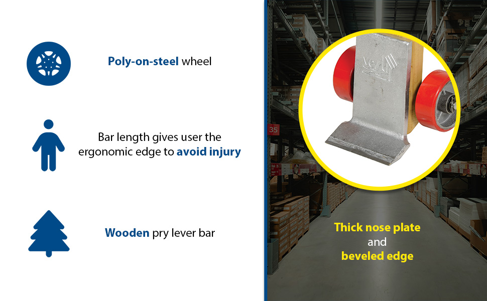 Provide dock workers, riggers, and freight handlers with the leverage needed to get underneath heavy objects for transporting with fork truck, hand truck, pallet truck, or machinery movers. Two (2) 5" x 2" poly-on-steel wheels. 5/8" thick steel nose plate with beveled edge is bolted on the wood handle units and welded on the steel units. Steel units feature baked-in powder-coated toughness.