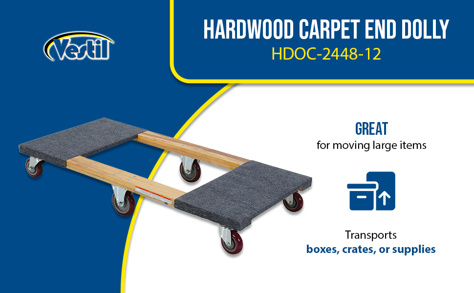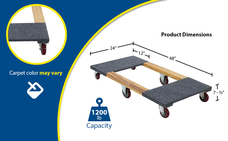 | HDOC-2448-12 | ![]() | 30 Days Limited Warranty | Hardwood Carpet End Dolly 48 In. x 24 In. x 7-1/2 In. 1200 Lb. Capacity | Uniform Capacity (lb.): 1,200 Deck Width (in.): 24 | 30 | ||