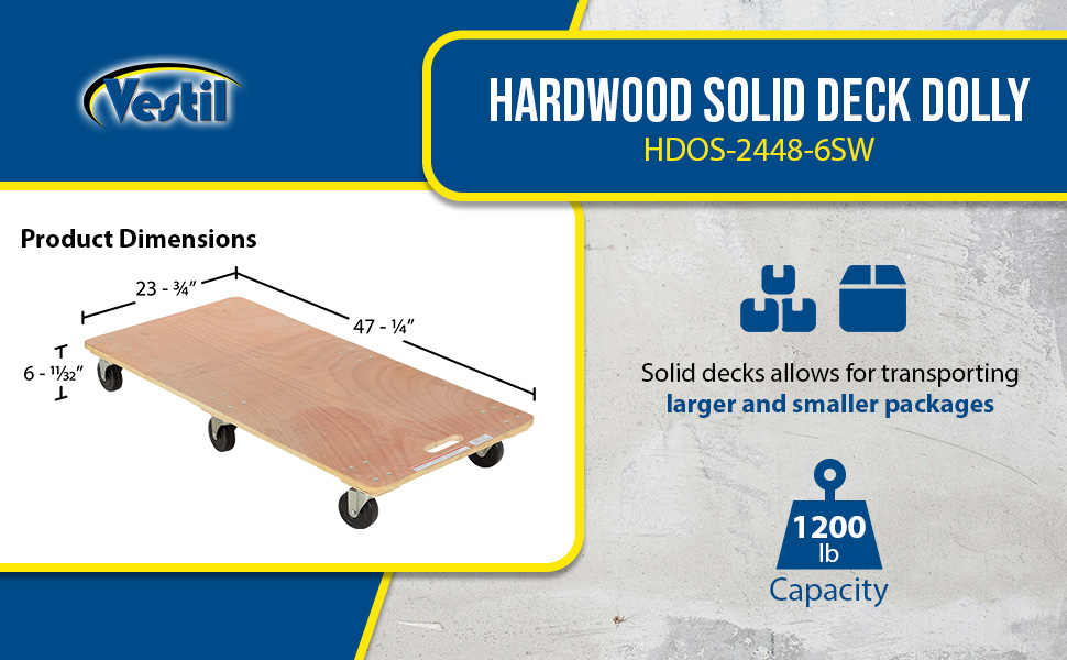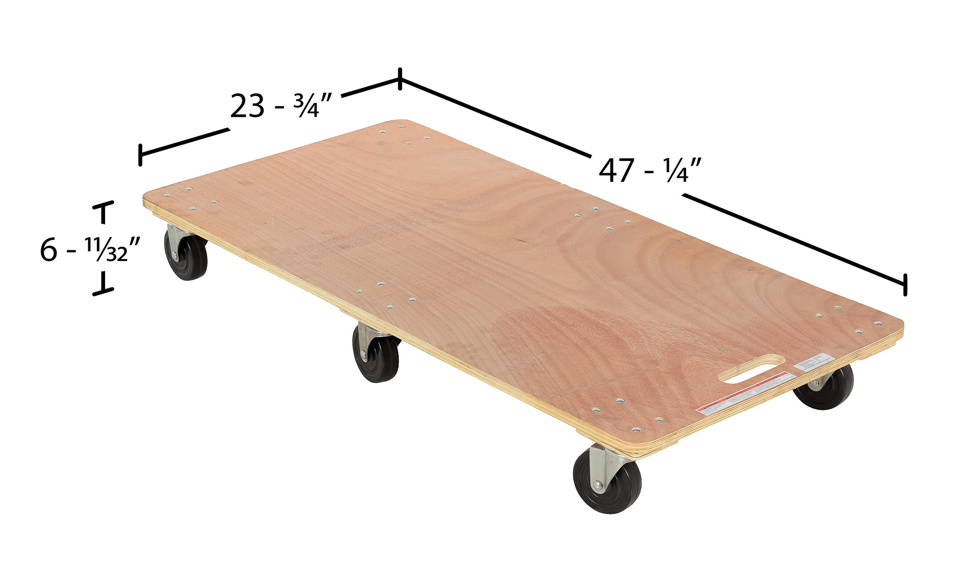| HDOS-2448-6SW | ![]() | 30 Days Limited Warranty | Hardwood Solid Deck Dolly 47-1/4 In. x 23-1/2 In. x 6-1/4 In. 1200 Lb. Capacity | Uniform Static Capacity (lb.): 1,200 Swivel Caster Diameter (in.): 4 | 29 |