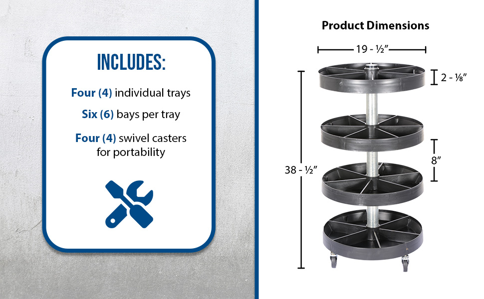 Cut parts picking time in half with these space saving, rotating Parts Bins. Compact enough to fit in small spaces such as corners and ends of aisles. Great for organization of small parts. Ideal for use in commercial and industrial applications. Rugged molded plastic construction with four swivel casters for portability. Each shelf is 2-1/8" deep. The space between the shelves is 8".