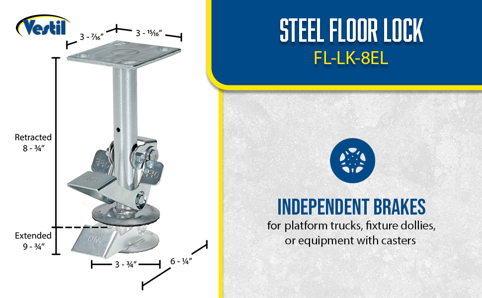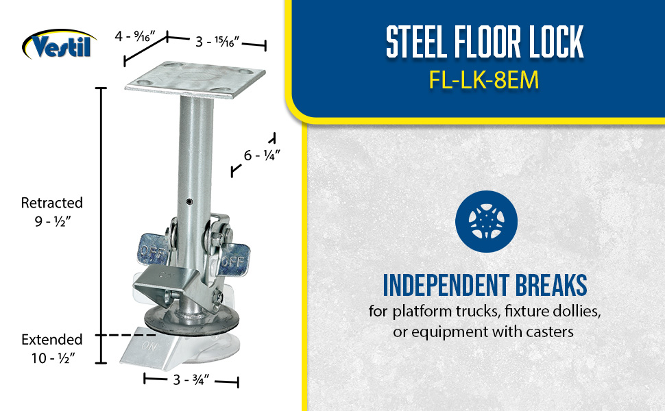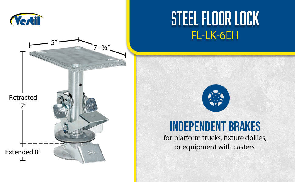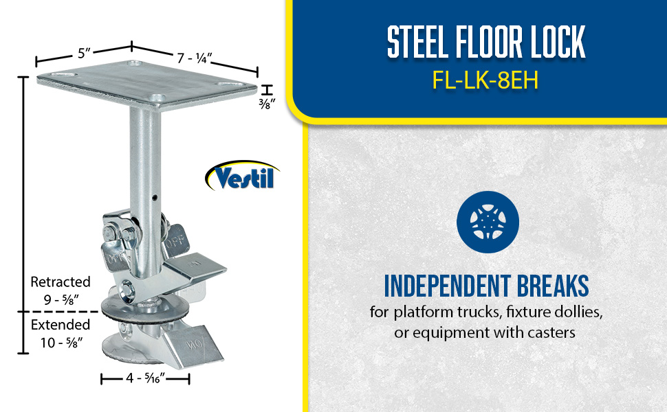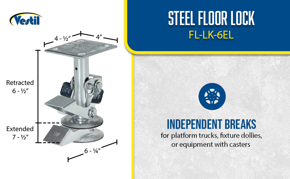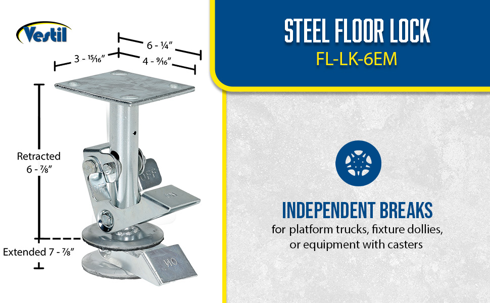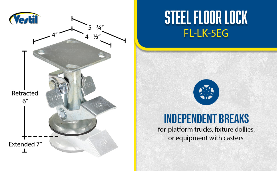 FL-LK-4E FL-LK-4ESteel Top Mount Floor Lock 4-7/8 to 5-5/8 In. Height Silver 1,200 Lb. CapacityCaster Diameter (in.): 4