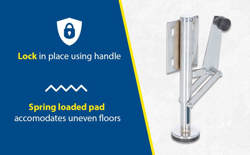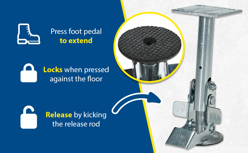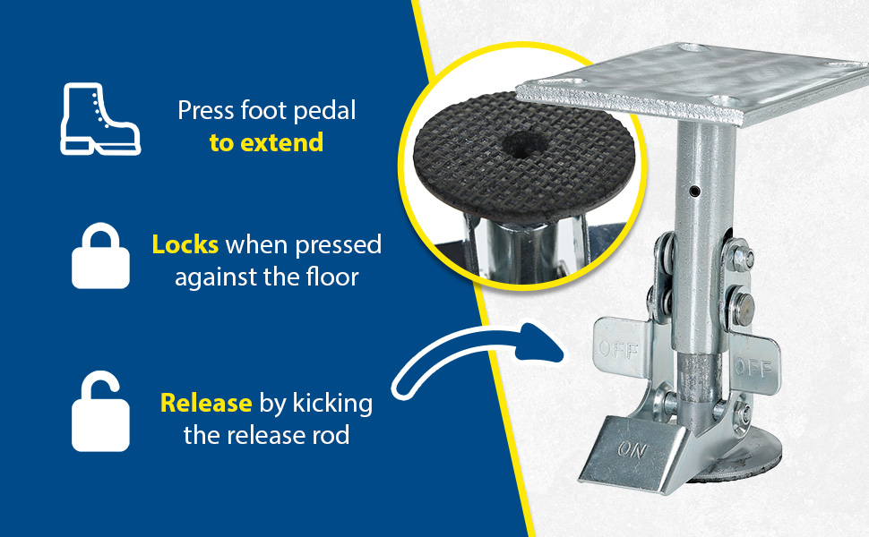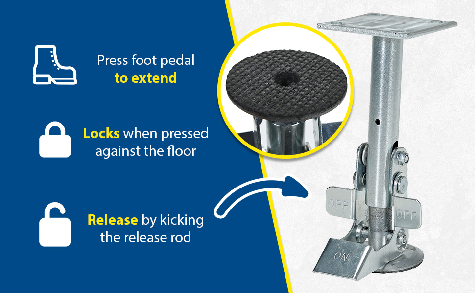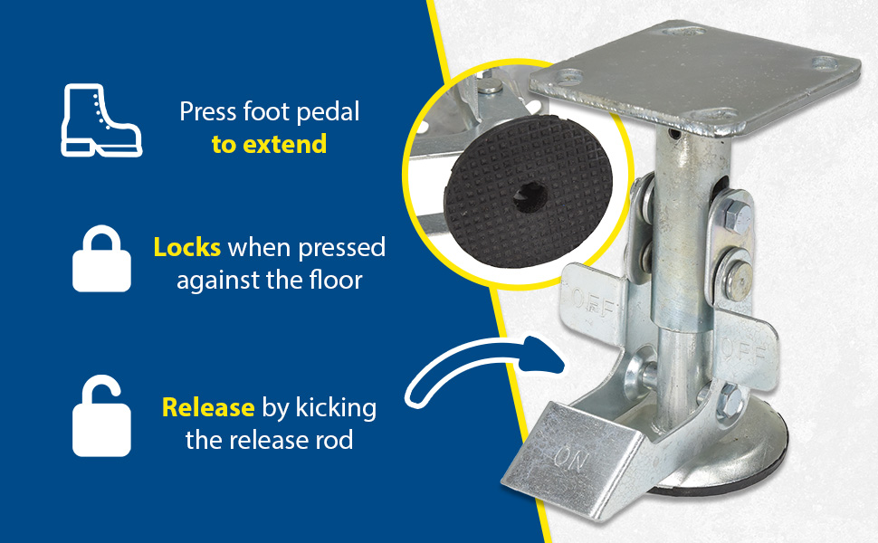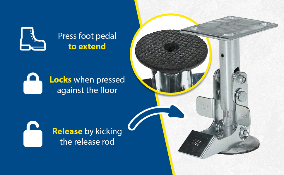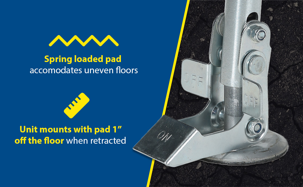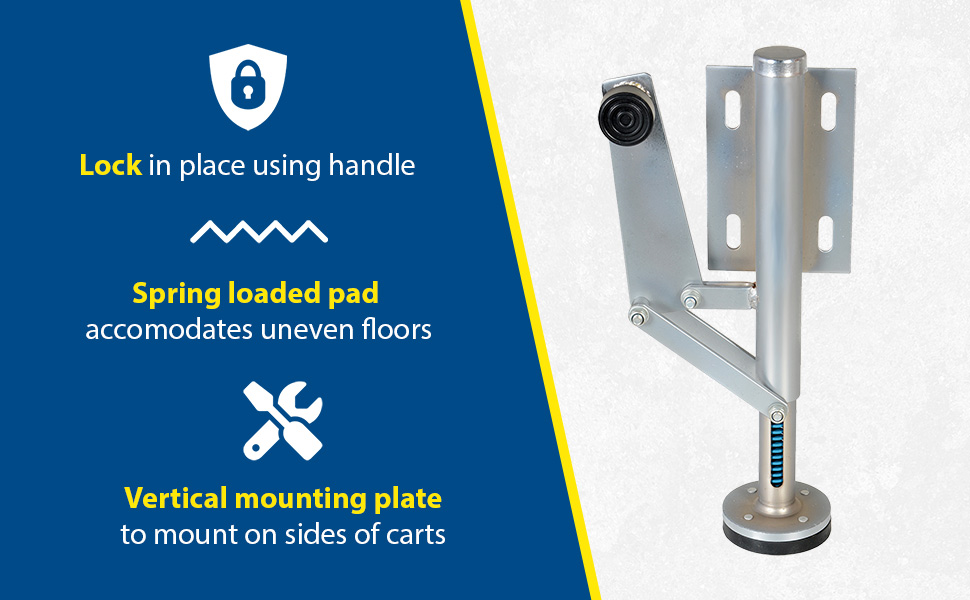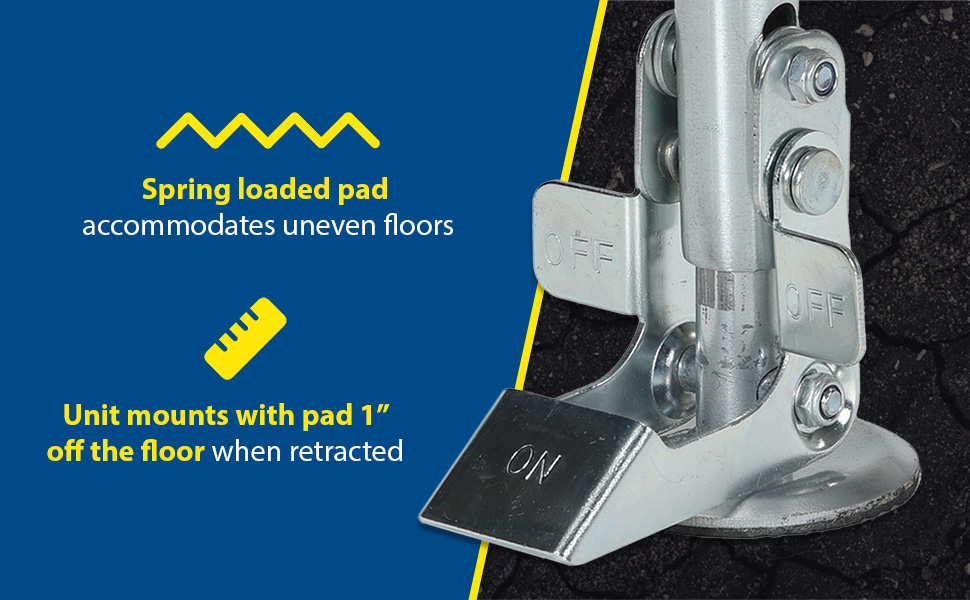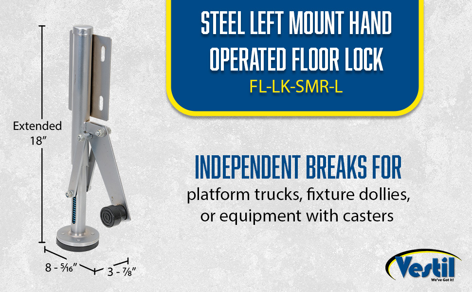 Floor Locks may be used on platform trucks, fixture dollies, or equipment with casters. Brake is independent of casters and can be installed to any convenient location on the cart. Designed to be mounted to sides of carts and other portable products. The spring loaded pad accommodates uneven floors. Units mount with pad 1-1/2" off the floor when retracted.