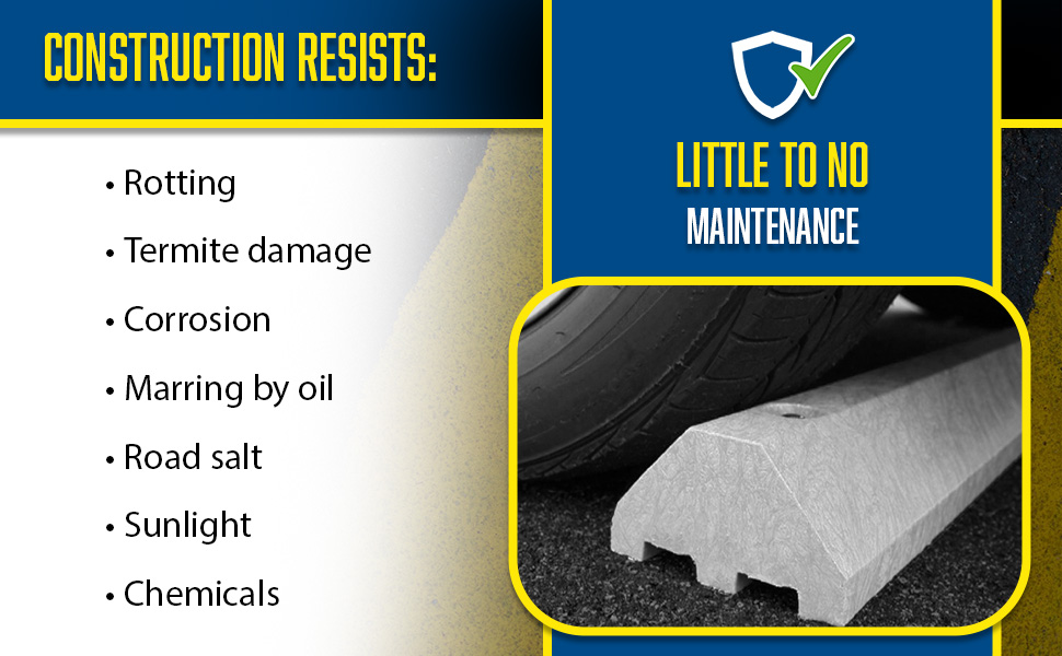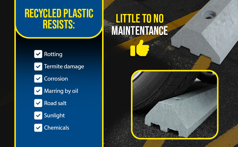 Made of solid (no channels) recycled plastic. High-visibility colors enhances driver and pedestrian safety. Solid parking blocks are chemically formulated plastic that offer durability, virtually indestructible, user-friendly, easy to install, maintenance free, lightweight but stable, chemical and weather resistant, UV stabilized.