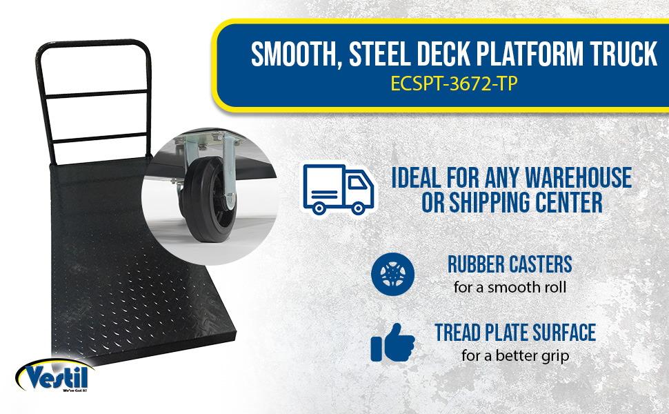 A steel tread plate on a platform truck is an upgrade to an old classic. A tread plate design enables the user with a better sense of security. With this added texture, the amount of jostling and movement by the products on the platform is limited. The steel handle allows the user to maintain an ergonomic posture while transferring goods. Mold on rubber casters roll smoothly. Powder coated finish provides added toughness.