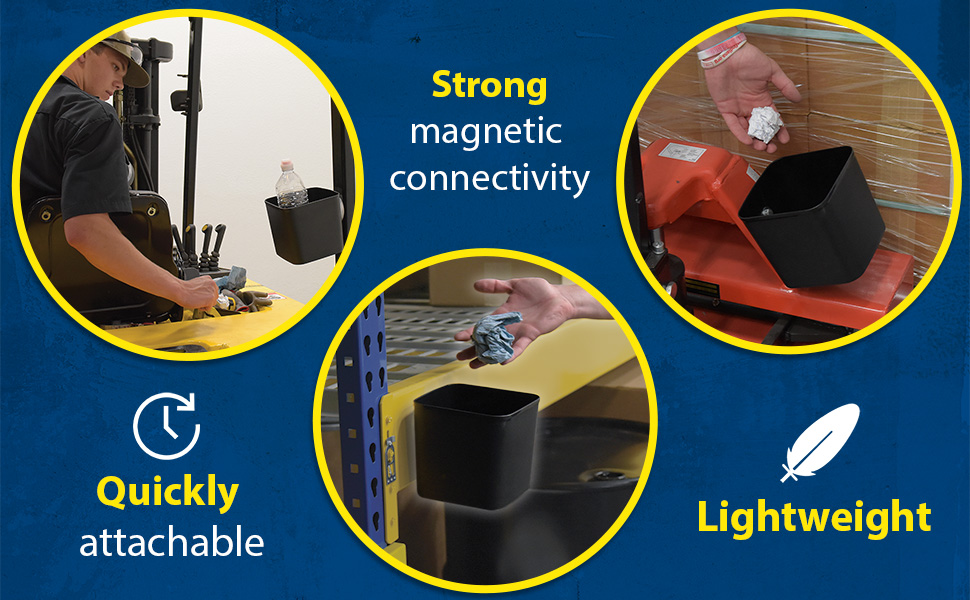 Forklifts have always had limited room for additional parts and tools. But, now, with the magnetic storage bin, carrying parts and tools has never been easier. Simply place the magnetic bin to the desired part of a forklift and begin filling with items. The plastic construction minimizes abrasion to items and is lightweight for maneuvering if needed.