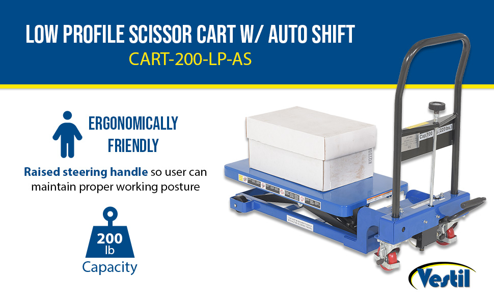 CART-200-LP-AS CART-200-LP-ASLow Profile Scissor Cart with Auto Shift 17-3/4 In. x 27-1/2 In. 200 Lb. Capacity Blue/BlackCapacity: 200 lbs.