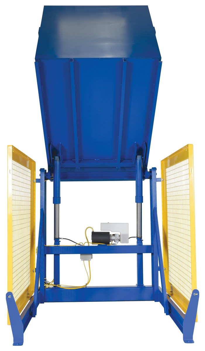 Designed for controlled dumping of material from boxes, crates, and other types of containers. Lowered height of only 3/8" allows for pallet truck loading and unloading. Retaining bar adjusts every 2" to accommodate a wide range of container heights. Each dump height has a hold down range, see chart. Maximum rotation is 135 degrees yielding a 45 degree dump angle. Unit may be stopped at any point during the dump cycle. Chute reach is 10" when fully rotated. Internal 2HP power unit and hand held control standard (5.5 HP power unit on 6,000 pound models). Protective mesh side screens included. Heavy-duty welded steel construction. Standard duty cycle equals maximum 15 starts per hour in a normal environment. Duty cycle is calculated by starts per hour or number of times "up" button is pushed. Jogging (bouncing of the chute) is NOT recommended.