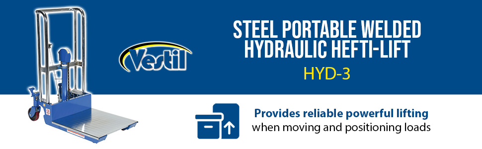 The Hefti-Lift units provide reliable powerful lifting when moving and positioning loads. The manual hydraulic foot pump yields 3/4" of platform travel per stroke, auto-shift models feature a two speed foot pump.The units roll smoothly on two rigid and two swivel poly-on-steel casters with foot operated brake. The units are designed of welded steel construction with chrome platforms and uprights (except model HYD-10-DA-SS) Each fork is 4-1/2"W x 2-1/2"H, the fork length is the same as the platform length. Overall fork width is 22". Not for use with pallets. Stainless Steel units are compact, lightweight, and capable of turning in a small radius when space is limited. A built-in automatic load check valve is included for improved safety. Model HYD-5-SS features a hydraulic foot pump, while model HYD-10-DA-SS comes with a dual acting manual hydraulic hand pump.