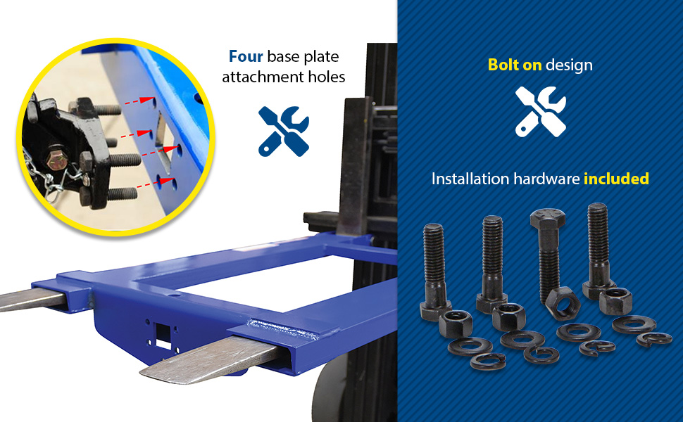 The Adjustable (PJ-2001) unit is designed to fit various types of electric pallet jacks. To use, simply loosen wing bolts and slide adjustable brackets to proper slot, then tighten wing bolts.