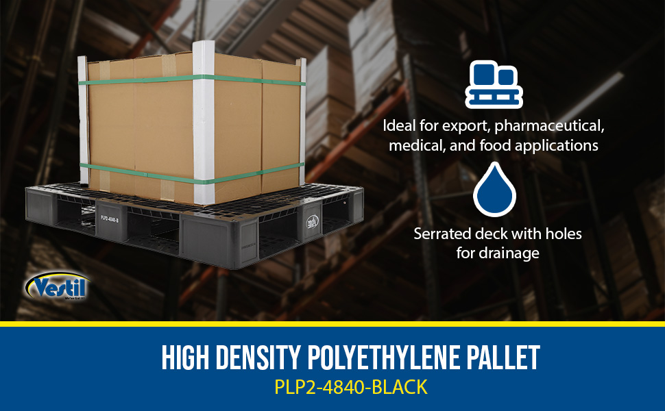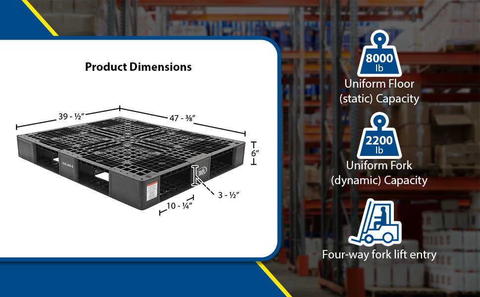 PLP2-4840-BLACK PLP2-4840-BLACKHigh Density Polyethylene Pallet 39-1/2 In. x 47-3/8 In. x 6 In. 8000 Lb. Capacity BlackUniform Floor (static) Capacity (lb.): 8,000