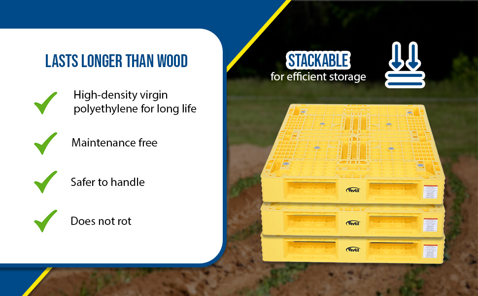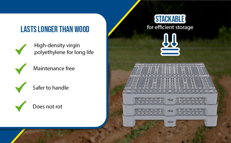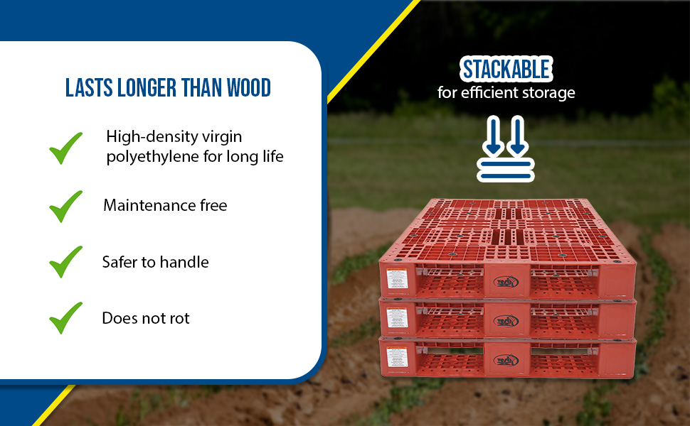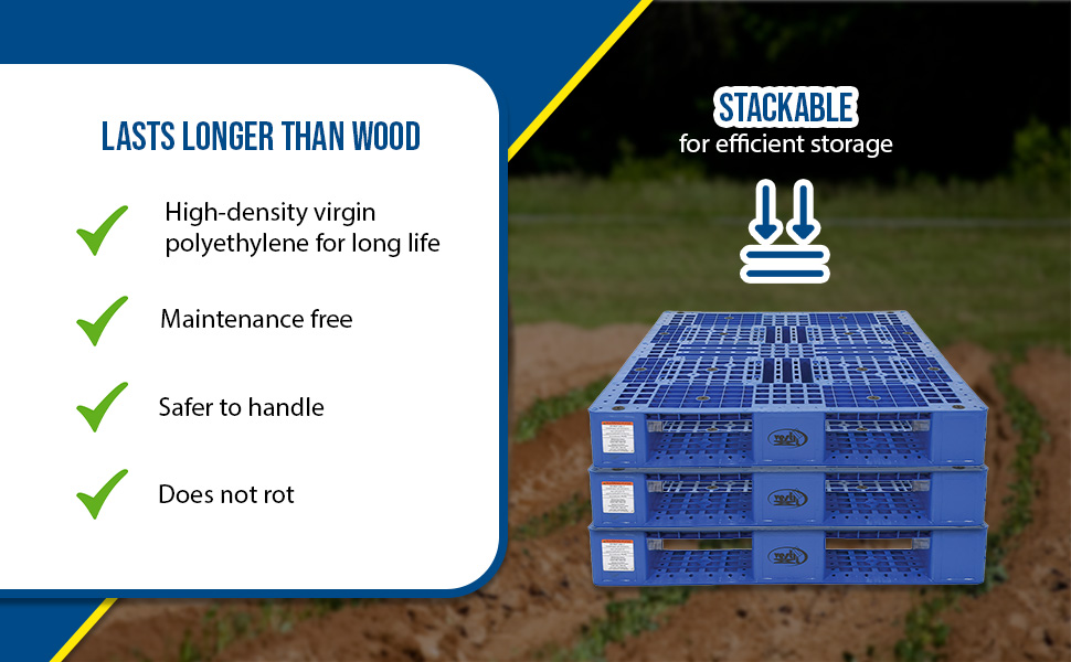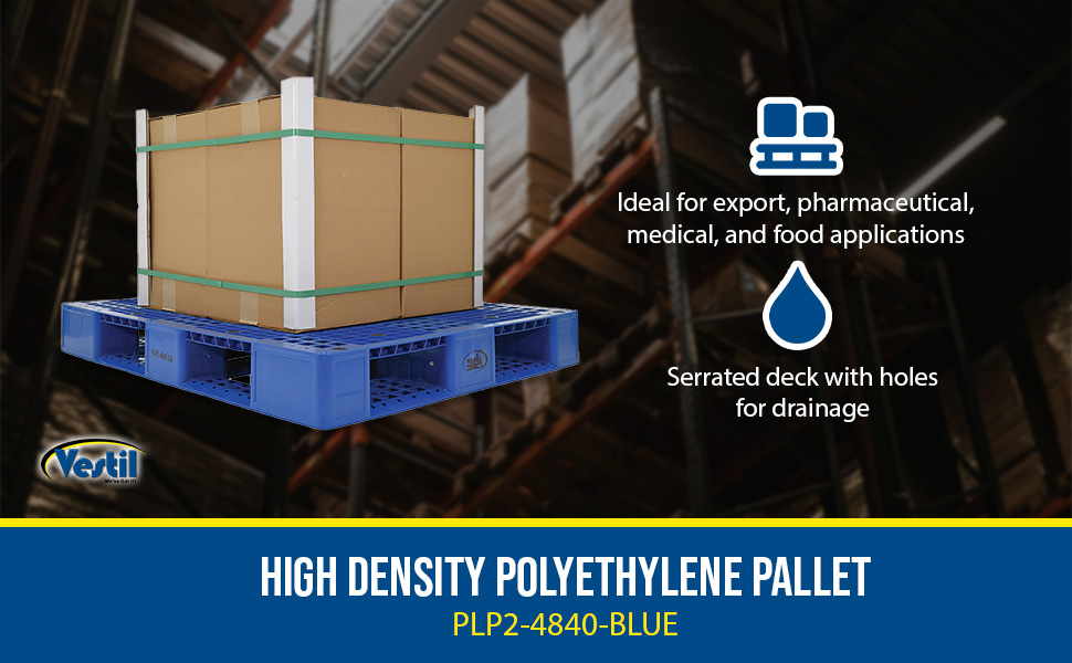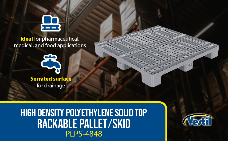 PLP2_GROUP_A.jpg Stackable for efficient storage. Made of high-density virgin polyethylene for longer life. Pallets are maintenance free and safer to handle than wooden pallets. Feature four (4) way entry. Serrated deck with holes for drainage. Plastic pallets are ideal for export, pharmaceutical, medical, and food applications. Model PLPS-4840-9L is a hygienic easy to clean solid deck skid.