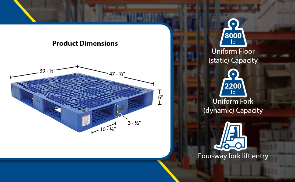 PLP2-4840-BLUE PLP2-4840-BLUEHigh Density Polyethylene Pallet 39-3/8 In. x 47-3/8 In. x 6 In. 8000 Lb. Capacity BlueUniform Floor (static) Capacity (lb.): 8,000