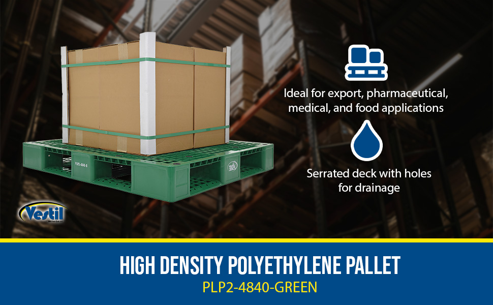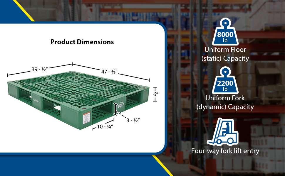PLP2-4840-GREEN PLP2-4840-GREENHigh Density Polyethylene Pallet 39-1/2 In. x 47-3/8 In. x 6 In. 8000 Lb. Capacity GreenUniform Floor (static) Capacity (lb.): 8000