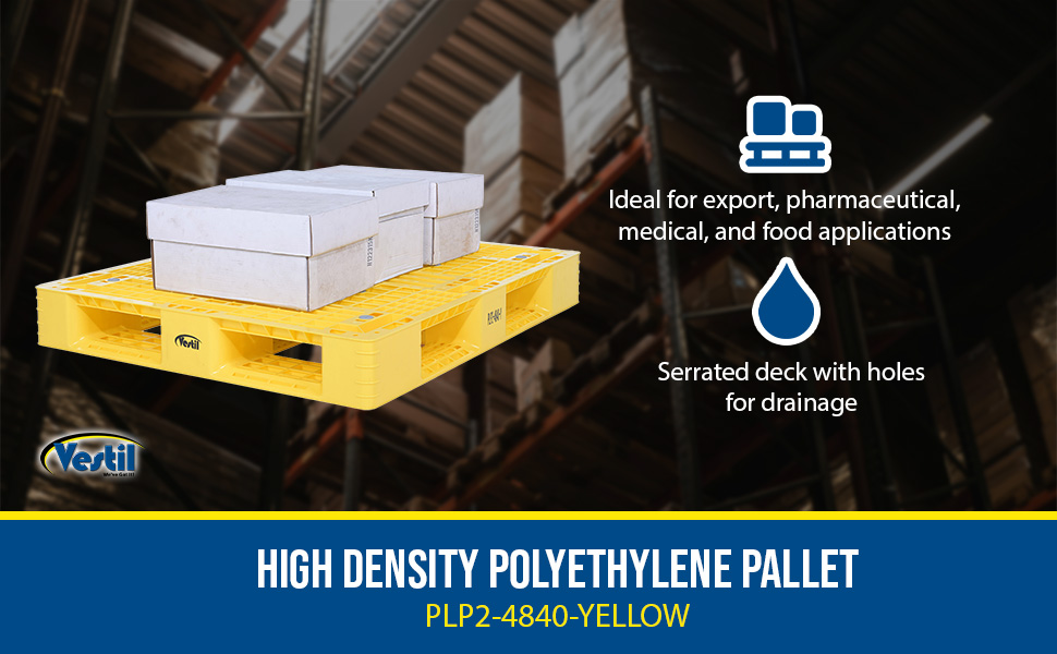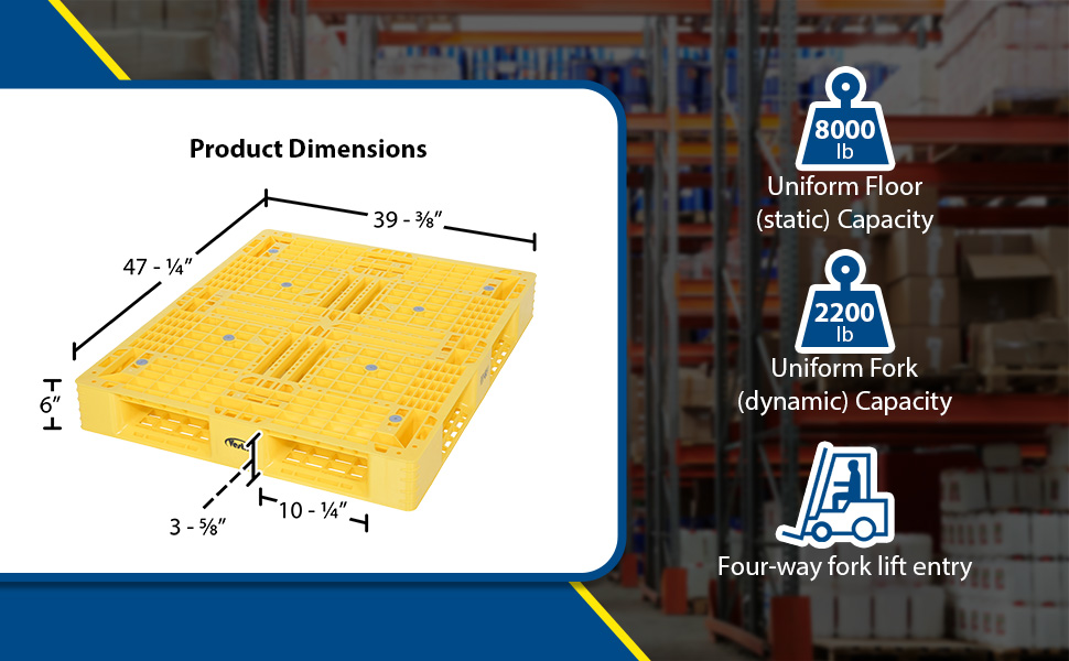 PLP2-4840-YELLOW PLP2-4840-YELLOWHigh Density Polyethylene Pallet 39-3/8 In. x 47-3/8 In. x 6 In. 8000 Lb. Capacity YellowUniform Floor (static) Capacity (lb.): 8,000