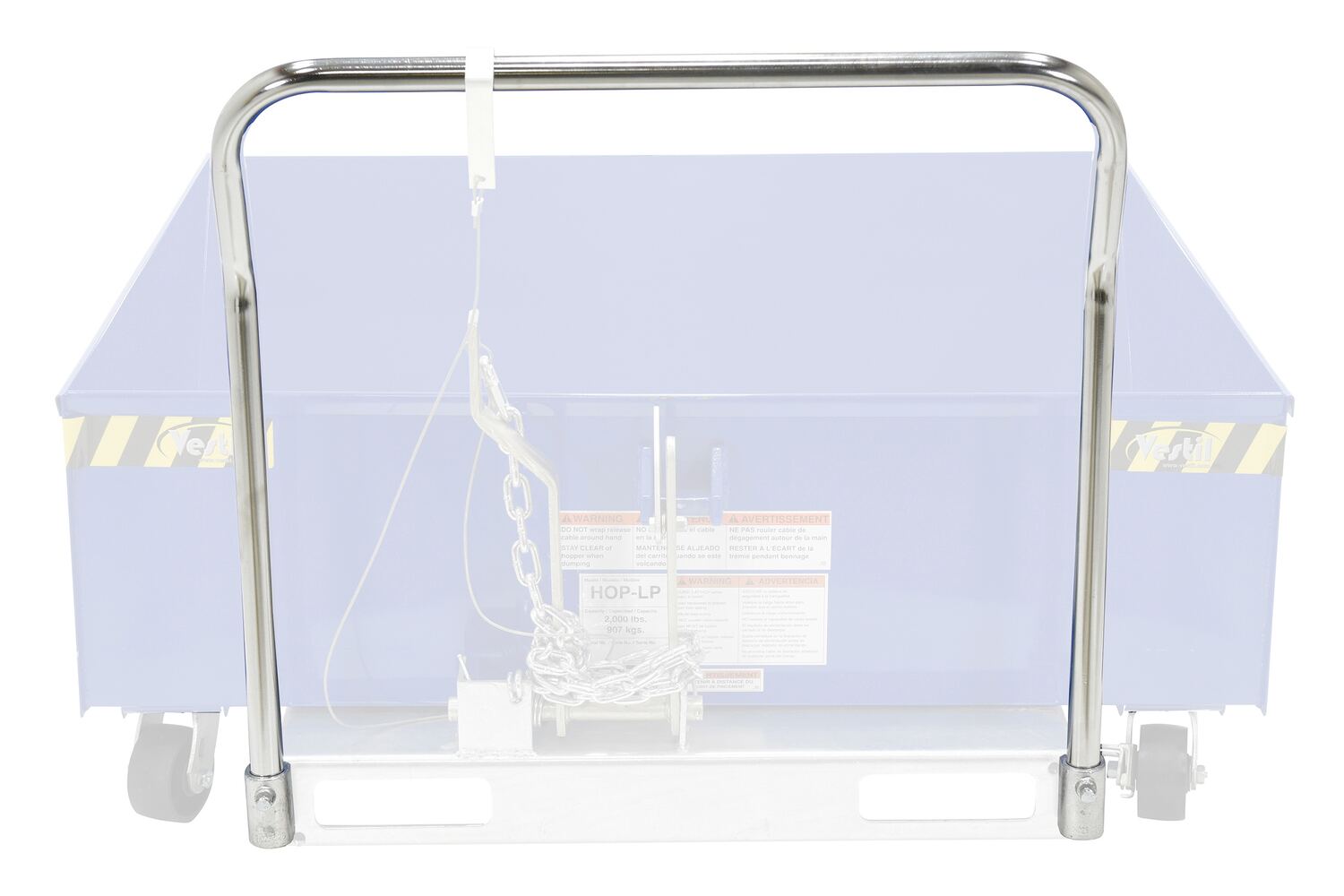 Units feature a full 90 degrees dump angle with a cushioned rubber bumper stop. The low profile design is essential for convenient loading. Dumping with a fork truck is quick and simple. A cable is pulled from the seat of the fork truck to dump the hopper. The unit returns to an upright and locked position when lowered to the ground. The included safety restraint/chain must be securely attached to the lift truck without slack. 22" L usable fork pockets measure 7"W x 2"H. Formed base thickness is 1/4". Blue baked-in powder-coated toughness with a galvanized base. Models H-25 may be stacked with H-50 models,while, the H-100 can be stacked with the H-150 models. The H-200 hoppers can only be stacked with other H-200 series models. Never stack hoppers more than 3 high. Must be attached to fork truck when dumping.