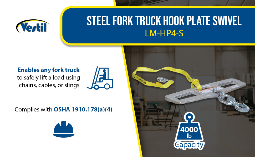 | LM-HP4-S | ![]() | 90 Days Limited Warranty | Steel Fork Truck Hook Plate Swivel 4,000 Lb. Capacity Silver | Uniform Capacity (lb.): 4,000 Height without Hook (in.): 6 | 22 | ||