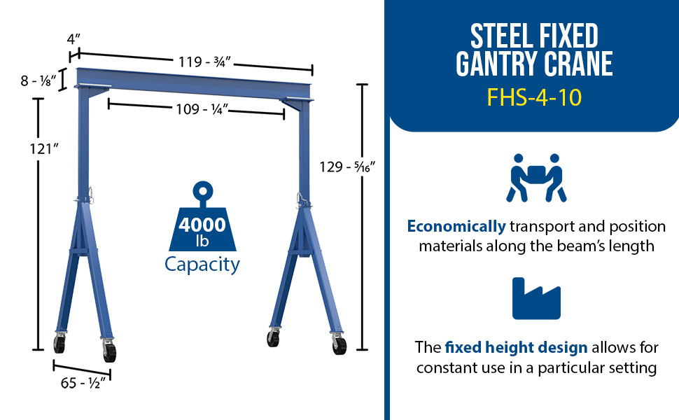 FHS-4-10 FHS-4-10Steel Fixed Gantry Crane with Phenolic Casters 10 Ft. 4000 Lb. Capacity BlueUniform Capacity (lb.): 4,000