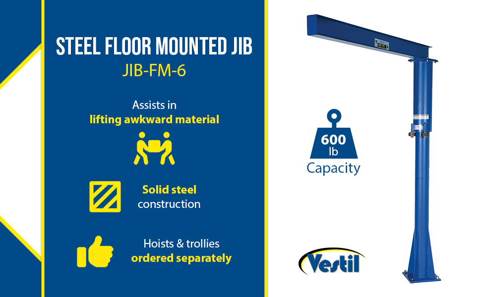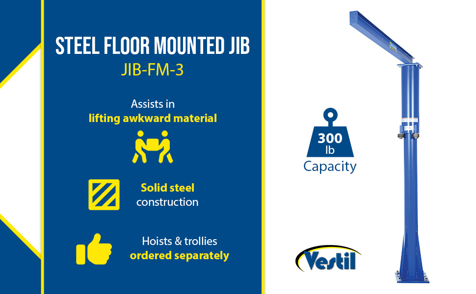 This floor mounted jib adapts well to a variety of applications. With the unique design, the job is functional in any direction or complete customization of the work station. Solid steel construction will assist workers in lifting awkward material. The overall I-beam length is 80", except for model JIB-FM-40 which has an I-beam length of 80-3/8". Hoists & Trollies can be ordered seperately.