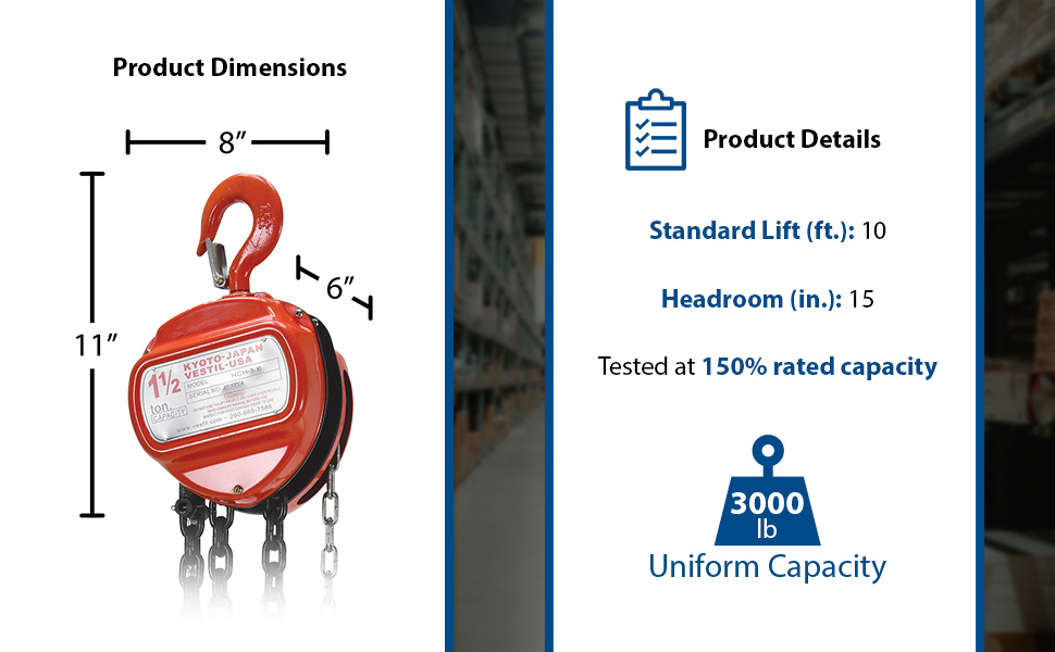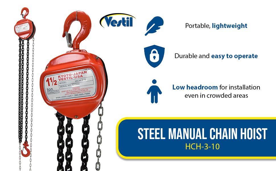 HCH-3-10 HCH-3-10Steel Manual Chain Hoist 10 Ft. Lift 3,000 Lb. Capacity OrangeUniform Capacity (lb.): 3,000