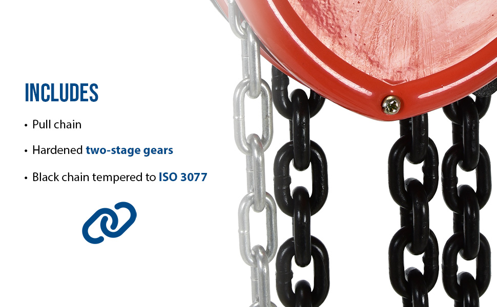 These portable, lightweight hoists are durable and easy to operate. Compact design and low headroom allow installation in confined areas. Enclosed double ratchet pawls with self adjusting disc brake standard. Designed with a safety factory 4 times rated capacity. Individually tested at 150% rated capacity. Features grade 80 black chain tempered to ISO 3077, pull chain, hardened two-stage gears and forged steel upper and lower hooks with safety latches. Constructed of high quality steel components ideal for industrial applications. Meets ANSI B30.16-2003 requirements.