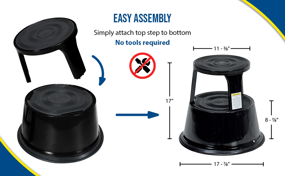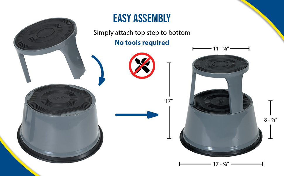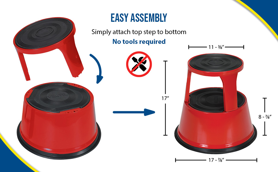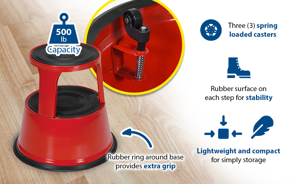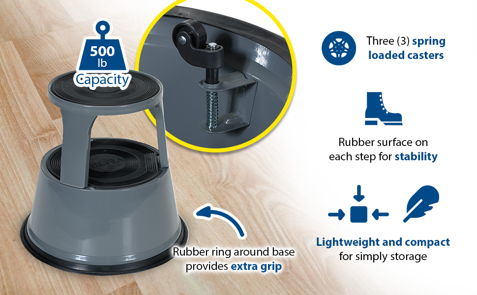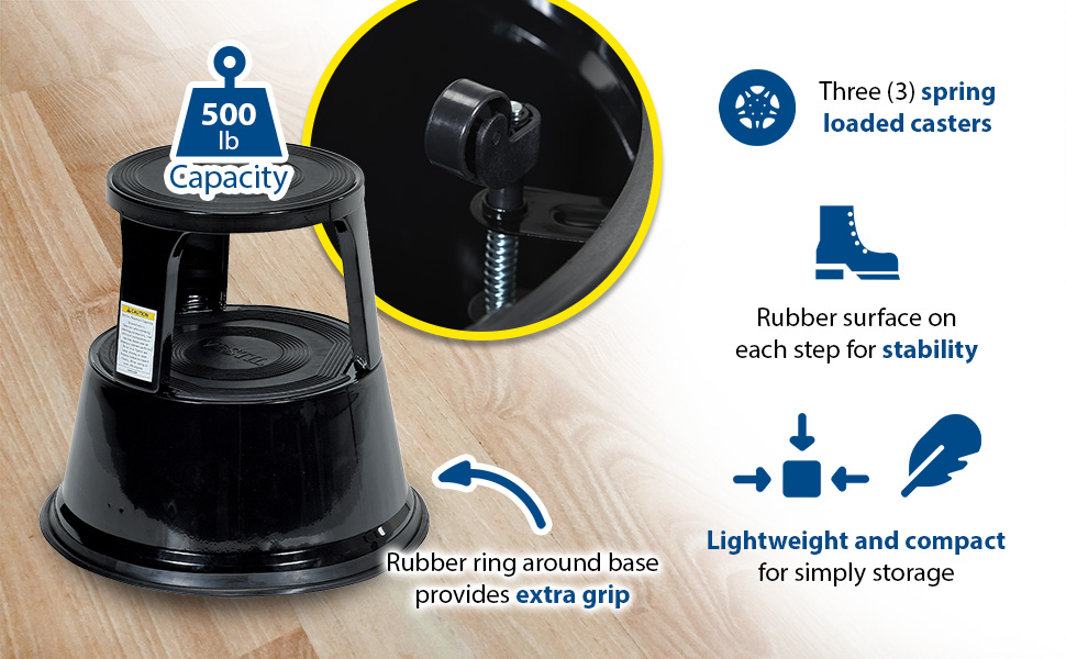 Convenient and easy to use. Spring loaded casters along with a rubber ring around the base provide the extra grip needed when being used. Each step includes a rubber surface. Steel construction with powder coat finish. Capacity is 500 pounds. Easily assembles without need for tools.