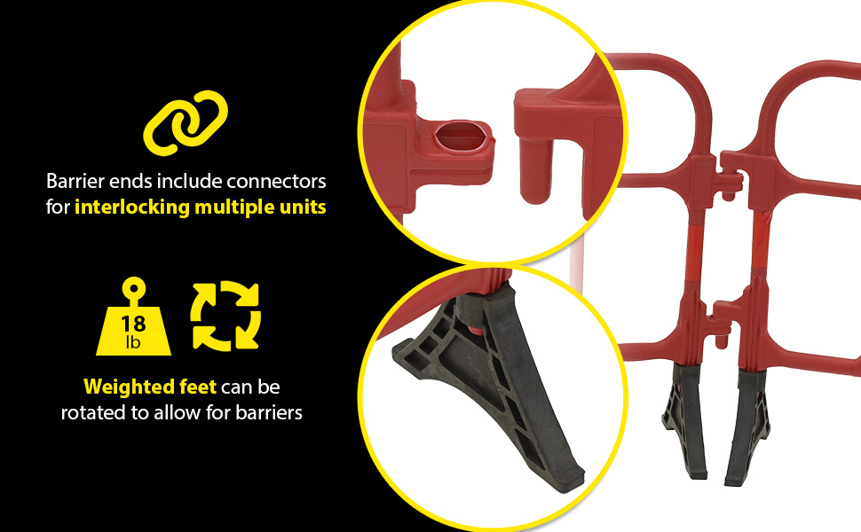 Plastic Interlocking Barriers will not rust and will retain attractive appearance. Reflective red tape provides better identification at night. Barrier ends include connectors for interlocking multiple units. Base feet are 15-1/2"L x 3"W. The non-removable feet come pre-filled with sand for weight ballast. Feet can be rotated 90 degrees to allow for barriers to be stacked. Manufactured from HDPE material and includes UV stabilizer for longer life. Ships and stores assembled.