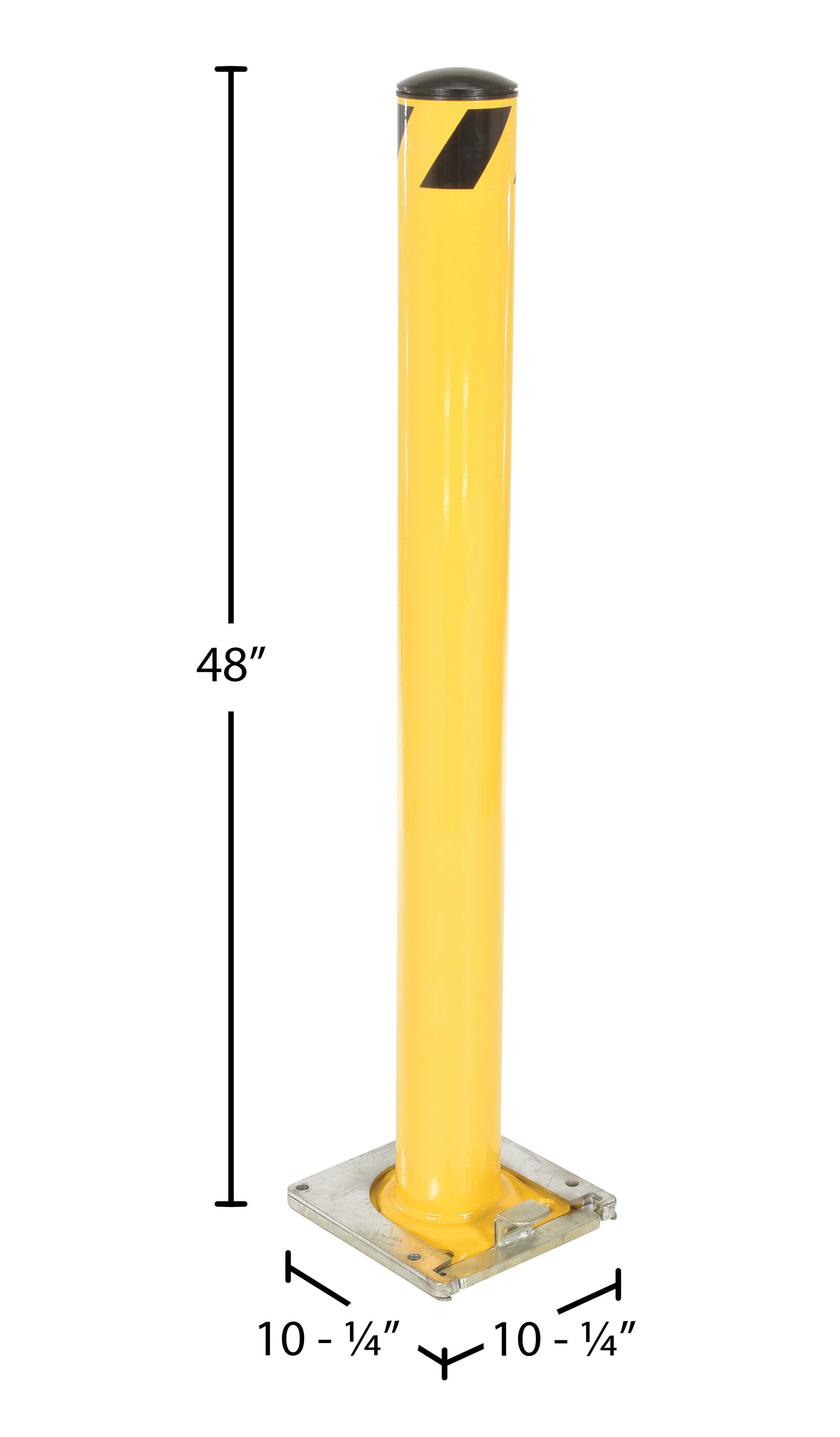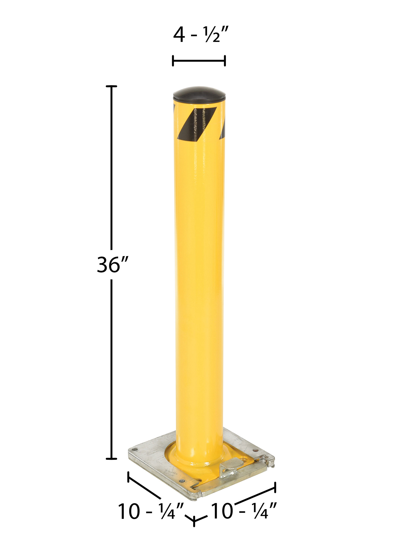 Bollards can be used both indoors and outdoors to protect work areas, racking and personnel. Surface mounted zinc coated steel base plate allows for quick and easy bollard removal. Steel base plate is bolted in place. Guard is easily inserted into base plate then secured in place. A padlock may be added to prevent unauthorized removal (padlock not included) Base plate measures 10-1/4"W x 10-1/2"L x 2"H height and include four (4) pre-drilled mounting holes. Plastic top caps are removable. Baked-in yellow powder coat finish for added toughness. Welded steel construction.