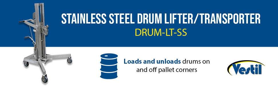 The Stainless steel hydraulic drum lifter is designed to allow the operator to load or unload drums on and off the corner of pallets. Straddle leg design allows the drum lifter to glide over standard pallets and grab most 30, 55, or 85 gallon steel and poly drums. Drums are raised and lowered easily using the foot pump. 304 grade all stainless steel construction. Ideal for washdown, pharmaceutical, and clean room applications. Highly maneuverable on two (2) rigid and two (2) swivel with brake nylon wheels. Cannot be used with fiber drums.