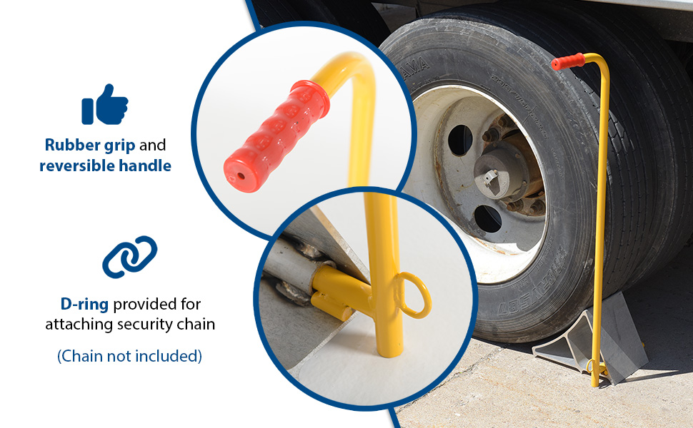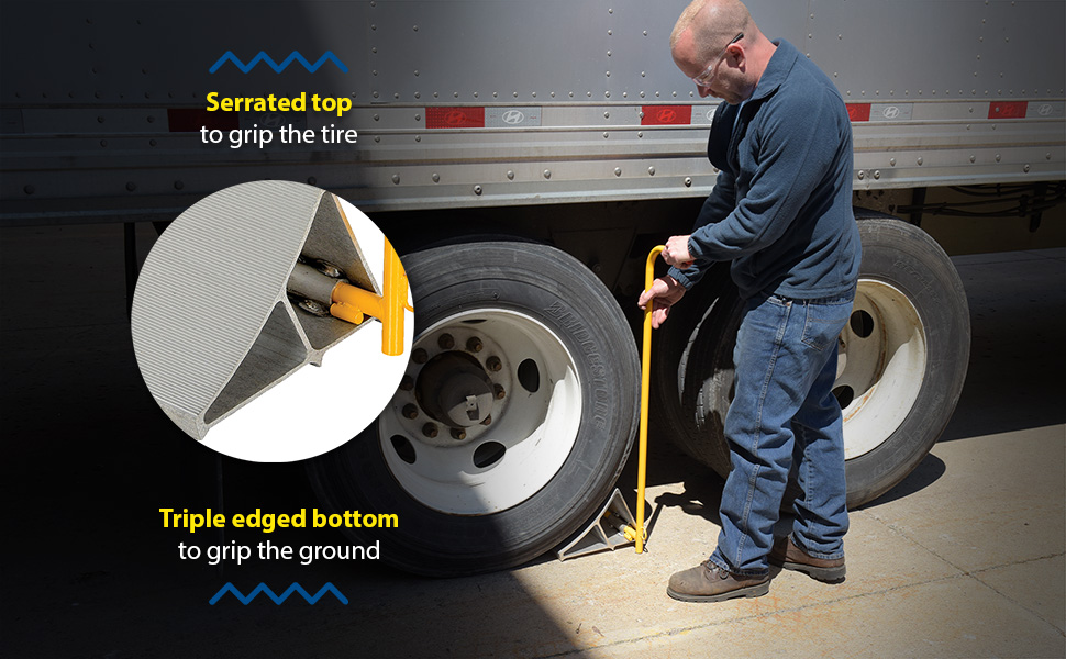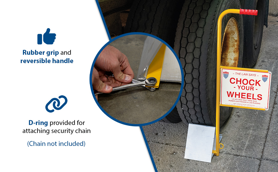 Constructed of extruded lightweight aluminum that is easy to handle. Features a serrated top to grip the tire and a triple edged bottom to grip the ground. Optional handle and sign attachment available. Customer signs available.