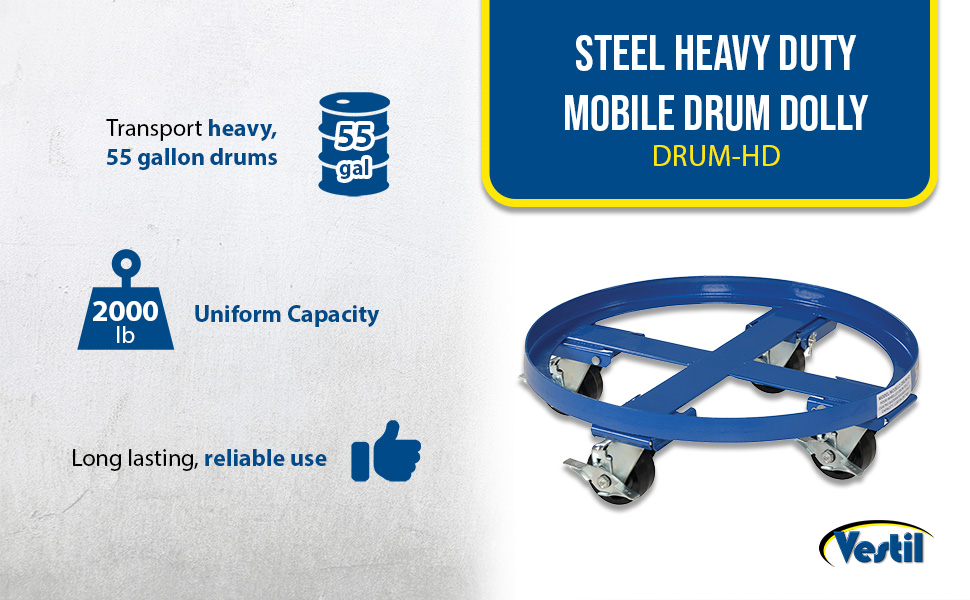 The Vestil Mobile Drum Dollies product family offers a safe, efficient, and cost-effective solution for handling, transporting, and positioning standard 30- and 55-gallon drums in industrial environments. Each dolly is engineered with a heavy-duty steel frame designed to support substantial weight capacities while maintaining easy maneuverability. Available in a range of models, these drum dollies feature durable casters that provide smooth rolling performance across various surfaces, allowing users to easily move filled drums without strain or risk of tipping. Many units include cross-supports and raised lips for added drum stability during transport, making them an essential tool for warehouses, manufacturing plants, and material handling facilities.