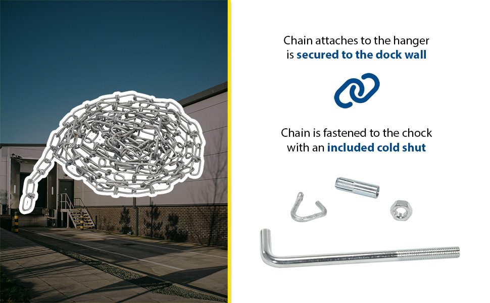 Chain and Hangers - Discourage theft and misplacement of wheel chocks. Facilitate safety in the dock area. 15' chain attaches to the hanger. Hanger is then secured to the dock wall. Chain is fastened to the chock with cold shut. OH-15-YEL bright color for clear visibility.