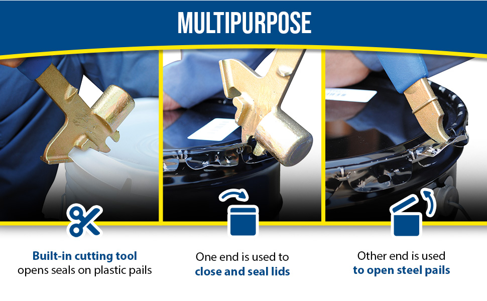 A must-have product for anyone using five gallon plastic and steel pails. The cutter is used to cut a slit in the lid lip of the pail to enable the lid of the plastic pail to be removed. The side guide conveniently slides under the lid lip for easy removal of the lid. The end hook is used to open steel pails. Just hook the lid lug and pry open. The opposite end is used to close and seal the lid by bending the lip back around the steel pail top. Not for UN rated pails.