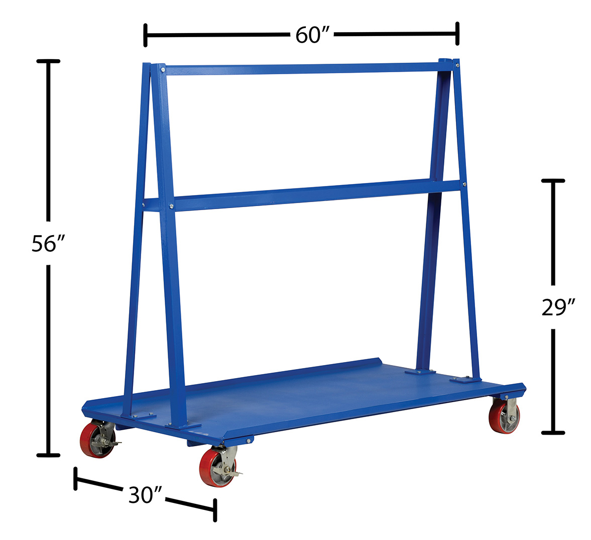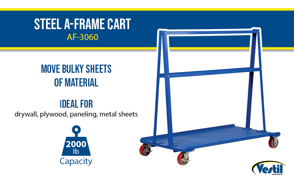| AF-2436 | ![]() | 90 Days Limited Warranty | Steel A-Frame Cart 24 In. x 36 In. 2,000 Lb. Capacity Blue | Uniform Capacity (lb.): 2,000 Deck Width (in.): 24 | 152 | ||