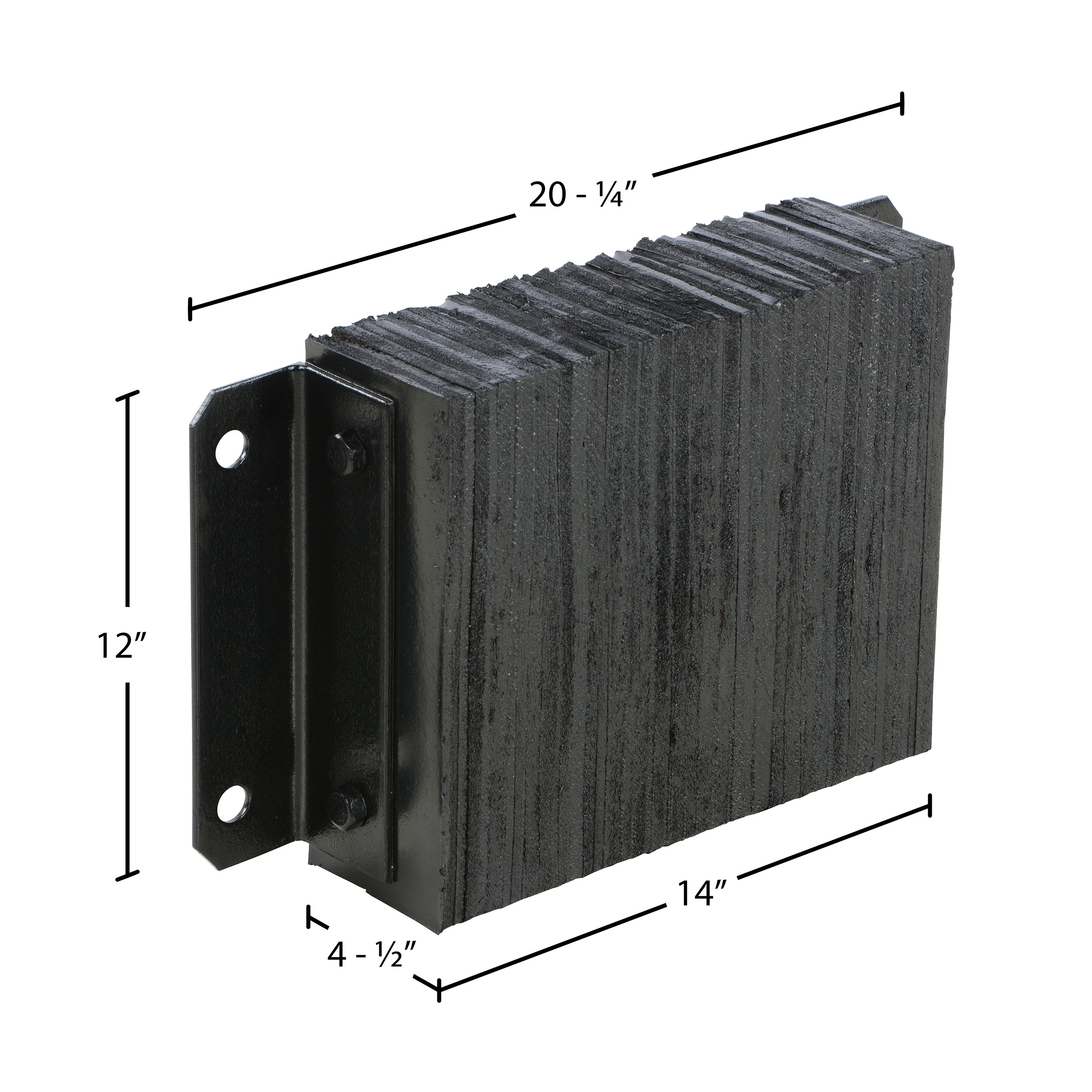 The laminated Dock Bumper provides durable, economical protection for loading docks and trailers. This unit is constructed of fabric reinforced rubber from recycled truck tires. The pads are laminated between painted structural angles and held together with steel tie rods. The width is bolt hole center to bolt hole center. Installation hardware sold separately.