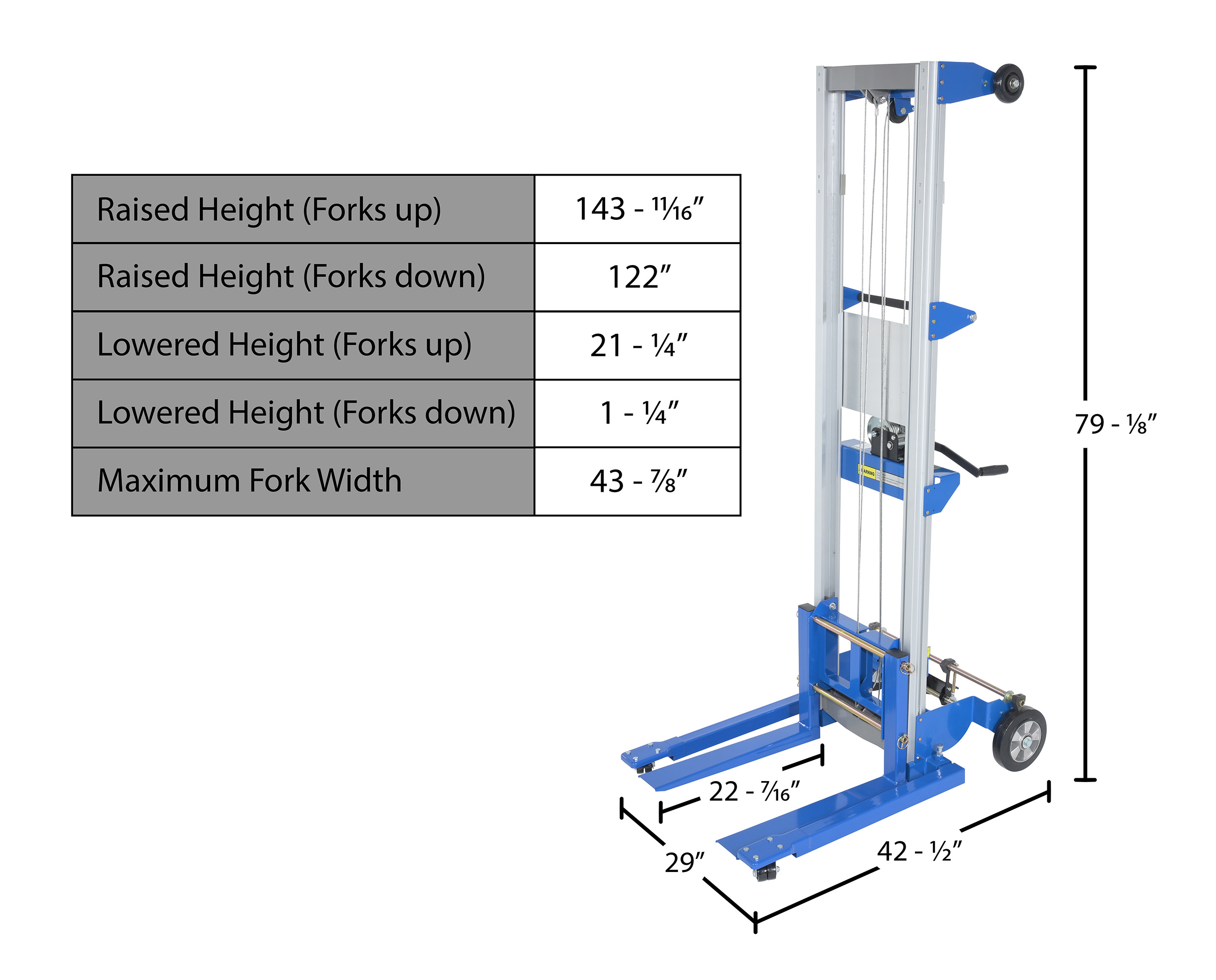 | Raised Height with Forks Up (in.): 143-11/16 | Fork Width (in.): 4 | Fork Height (in.): 1-3/4 |