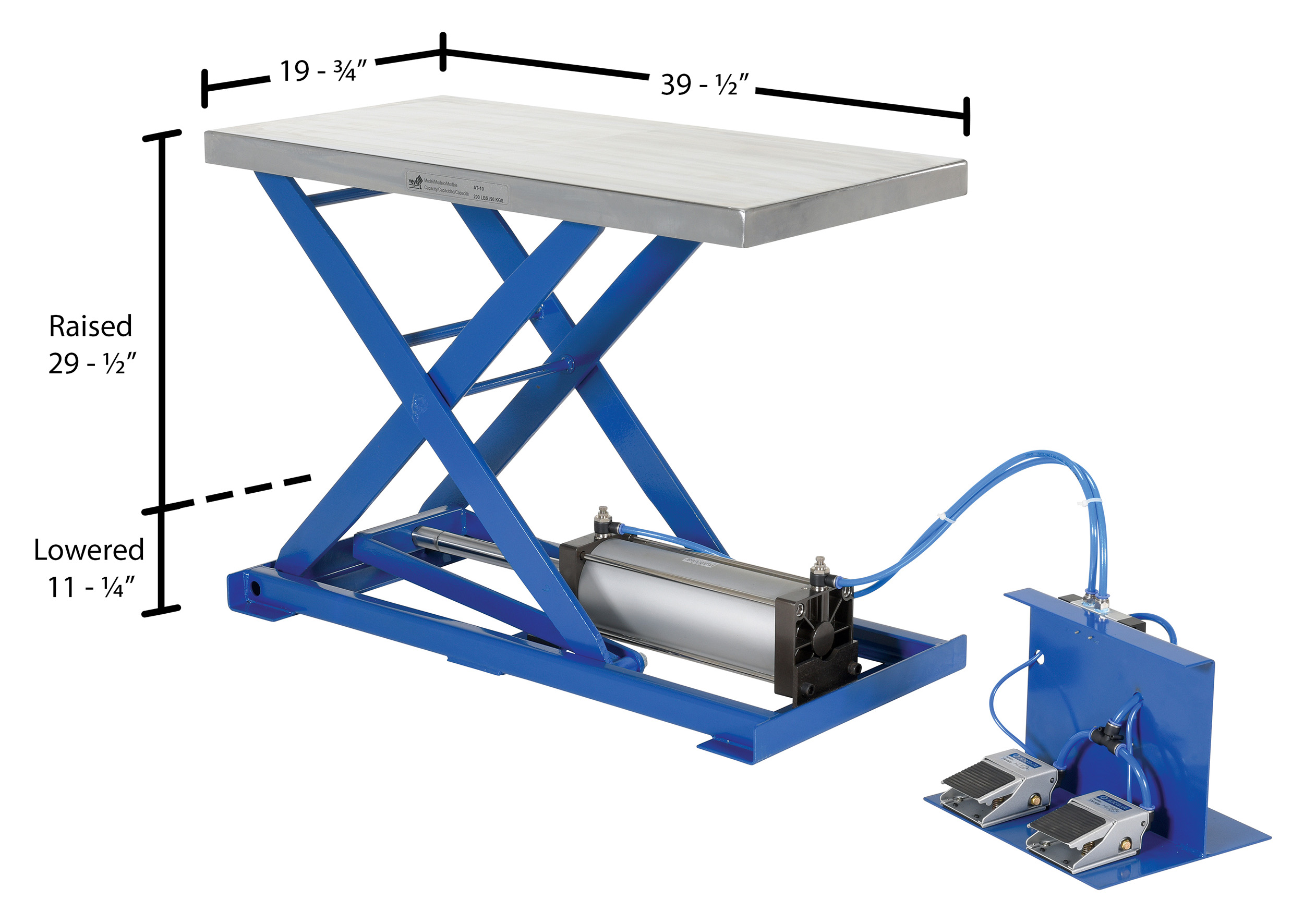 Steel Pneumatic Scissor Lift Table 39-1/2 In. x 19-3/4 In. x 29-1/2 In. 400 Lb. Capacity Blue