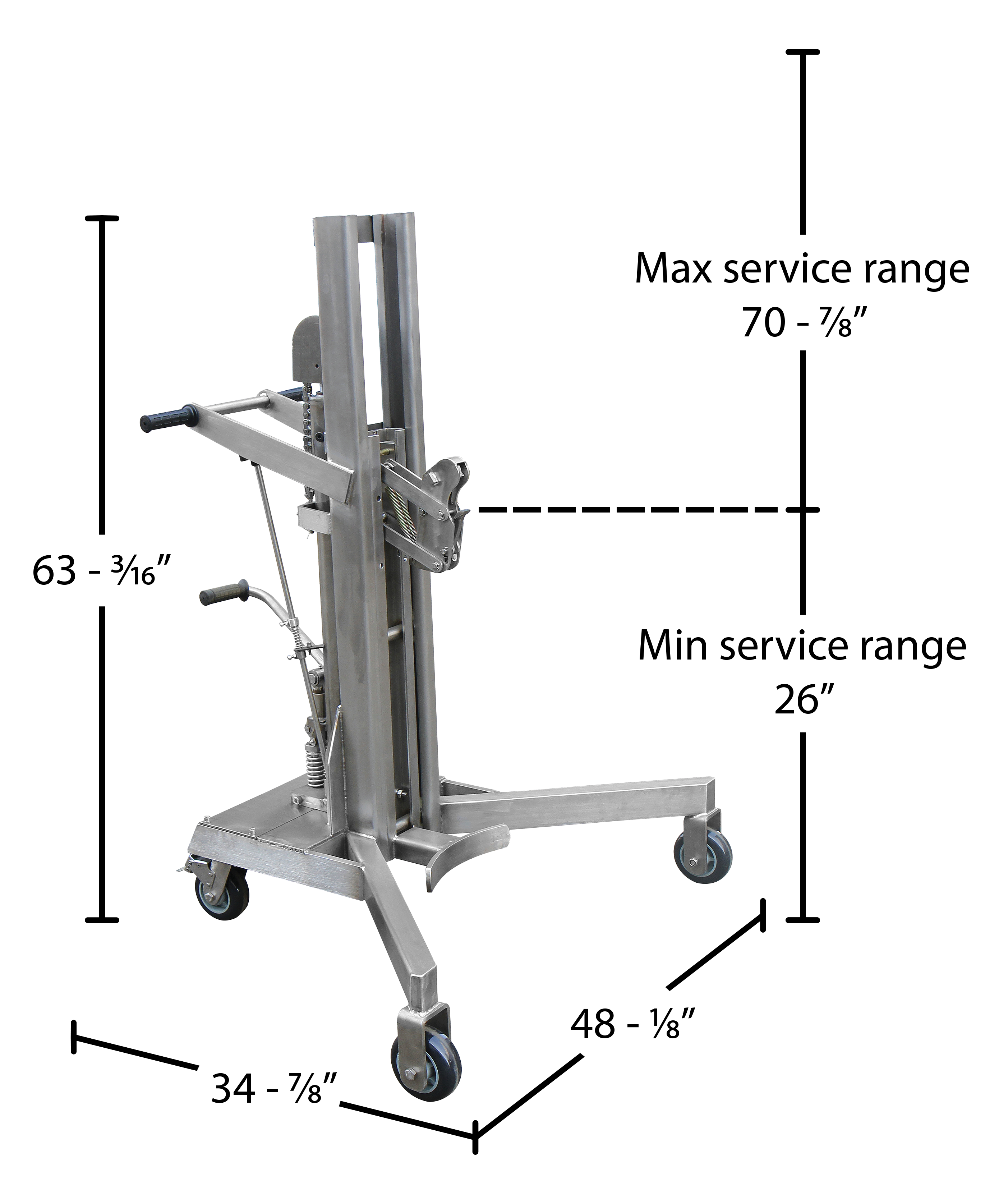 Stainless Steel Drum Lifter/Transporter 35 In. x 48 In. x 63 In. 800 Lb. Capacity SilverThe stainless steel hydraulic drum lifter is designed to allow the operator to load or unload drums on and off the corner of pallets. Straddle leg design allows the drum lifter to glide over standard pallets and grab most 30, 55, or 85 gallon steel and poly drums. Drums are raised and lowered easily using the foot pump. 304 Grade all stainless steel construction. Ideal for wash-down, pharmaceutical, and clean room applications.