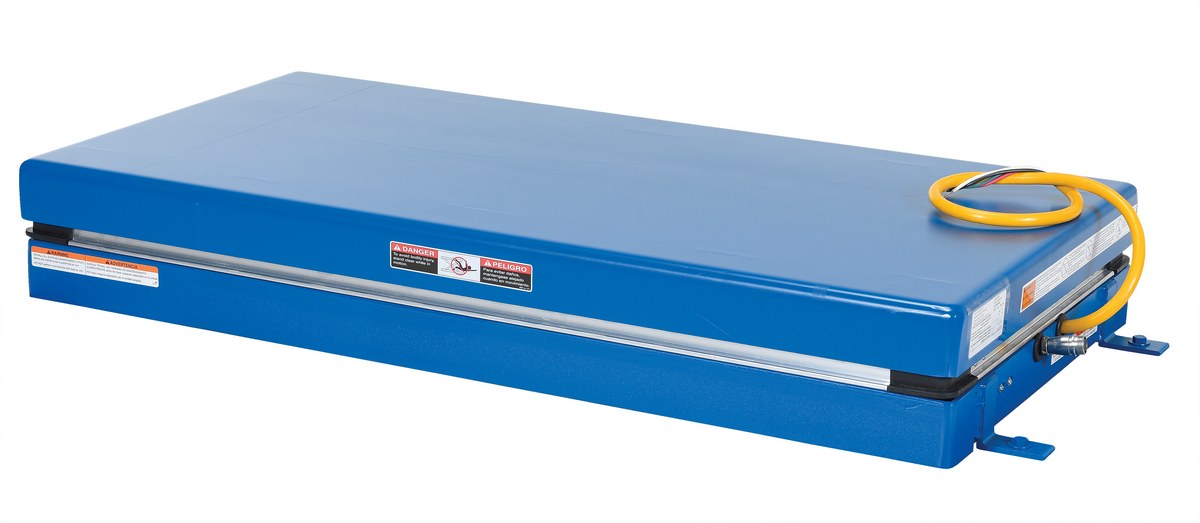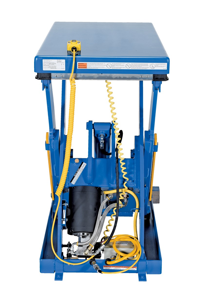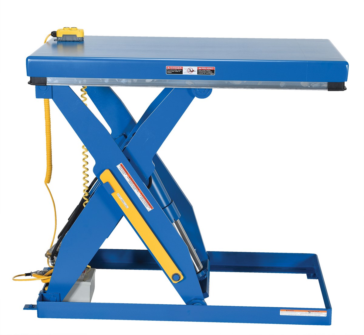 Steel Electric Hydraulic Lift Table 24 In. x 48 In. 3000 Lb. Capacity BlueThe electric hydraulic scissor lift table is used by all types of manufacturing and warehouse facilities. Safety features include a patented pinch point perimeter toe guard to protect pinch points while lowering the table, fused push button control, internal safety velocity fuse to maintain platform height in the event of hose or fitting failure, integral maintenance prop, adjustable upper travel limit switch to stop the table at maximum height, and displacement-style hydraulic cylinders for maximum strength. It also features a pressure plated pump, manifold system, and state-of-the-art lifetime lubricated bearings. The standard 56 frame electric motor is a fully enclosed with additional voltage options available. Contact factory if platform dimensions are crucial.