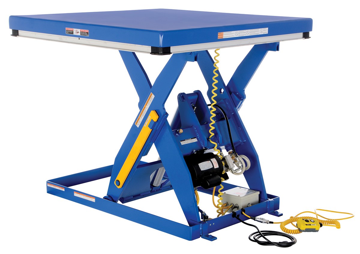 Steel Electric Hydraulic Lift Table 48 In. x 48 In. 3000 Lb. Capacity BlueThe electric hydraulic scissor lift table is used by all types of manufacturing and warehouse facilities. Safety features include a patented pinch point perimeter toe guard to protect pinch points while lowering the table, fused push button control, internal safety velocity fuse to maintain platform height in the event of hose or fitting failure, integral maintenance prop, adjustable upper travel limit switch to stop the table at maximum height, and displacement-style hydraulic cylinders for maximum strength. It also features a pressure plated pump, manifold system, and state-of-the-art lifetime lubricated bearings. The standard 56 frame electric motor is fully enclosed with additional voltage options available. Contact factory if platform dimensions are crucial.