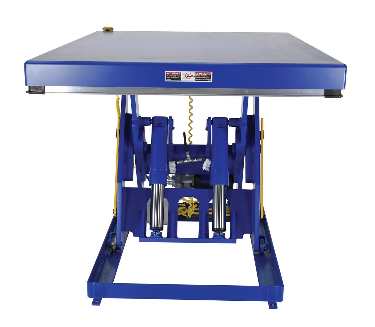Steel Electric Hydraulic Lift Table 48 In. x 72 In. 5000 Lb. Capacity BlueThe electric hydraulic scissor lift table is used by all types of manufacturing and warehouse facilities. Safety features include a patented pinch point perimeter toe guard to protect pinch points while lowering the table, fused push button control, internal safety velocity fuse to maintain platform height in the event of hose or fitting failure, integral maintenance prop, adjustable upper travel limit switch to stop the table at maximum height, and displacement-style hydraulic cylinders for maximum strength. It also features a pressure plated pump, manifold system, and state-of-the-art lifetime lubricated bearings. The standard 56 frame electric motor is fully enclosed with additional voltage options available. Contact factory if platform dimensions are crucial.