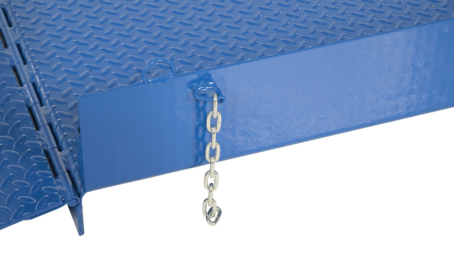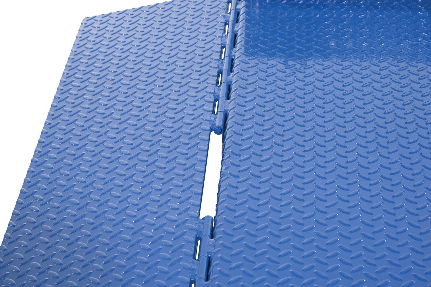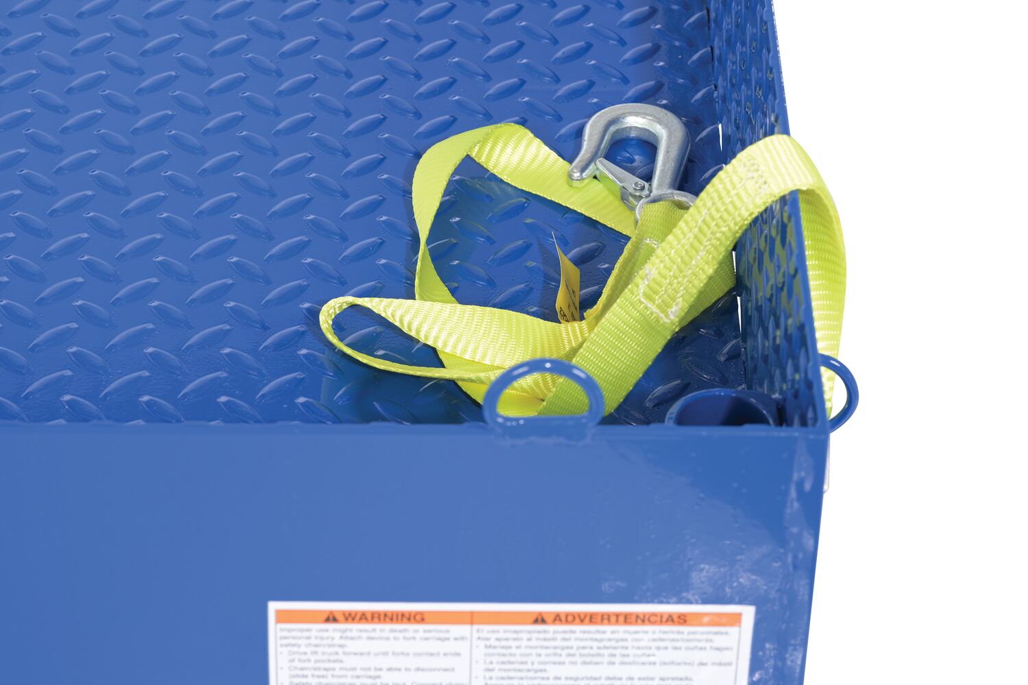 Steel Economical Portable Loading Platform 54 In. x 54 In. 2000 Lb. Capacity BlueThis loading platform for fork trucks allows fork trucks to load/unload items into trucks and trailers. Maximum uniform weight capacity is dependent on fork truck capacity. Includes fold-down lip to help with transition. Side guard toe boards. Four (4) tie-down rings are included for securing equipment (tie downs not included). Diamond tread plate floor for extra traction. Safety strap (included) to secure platform to fork truck. Steel construction with baked-in powder-coated toughness.