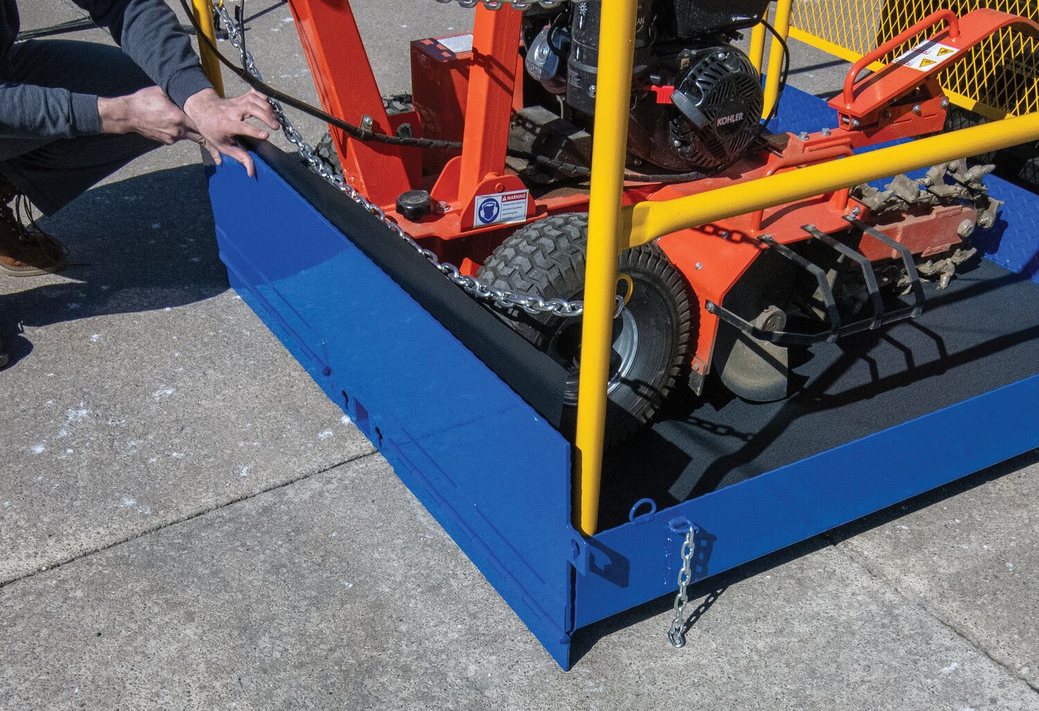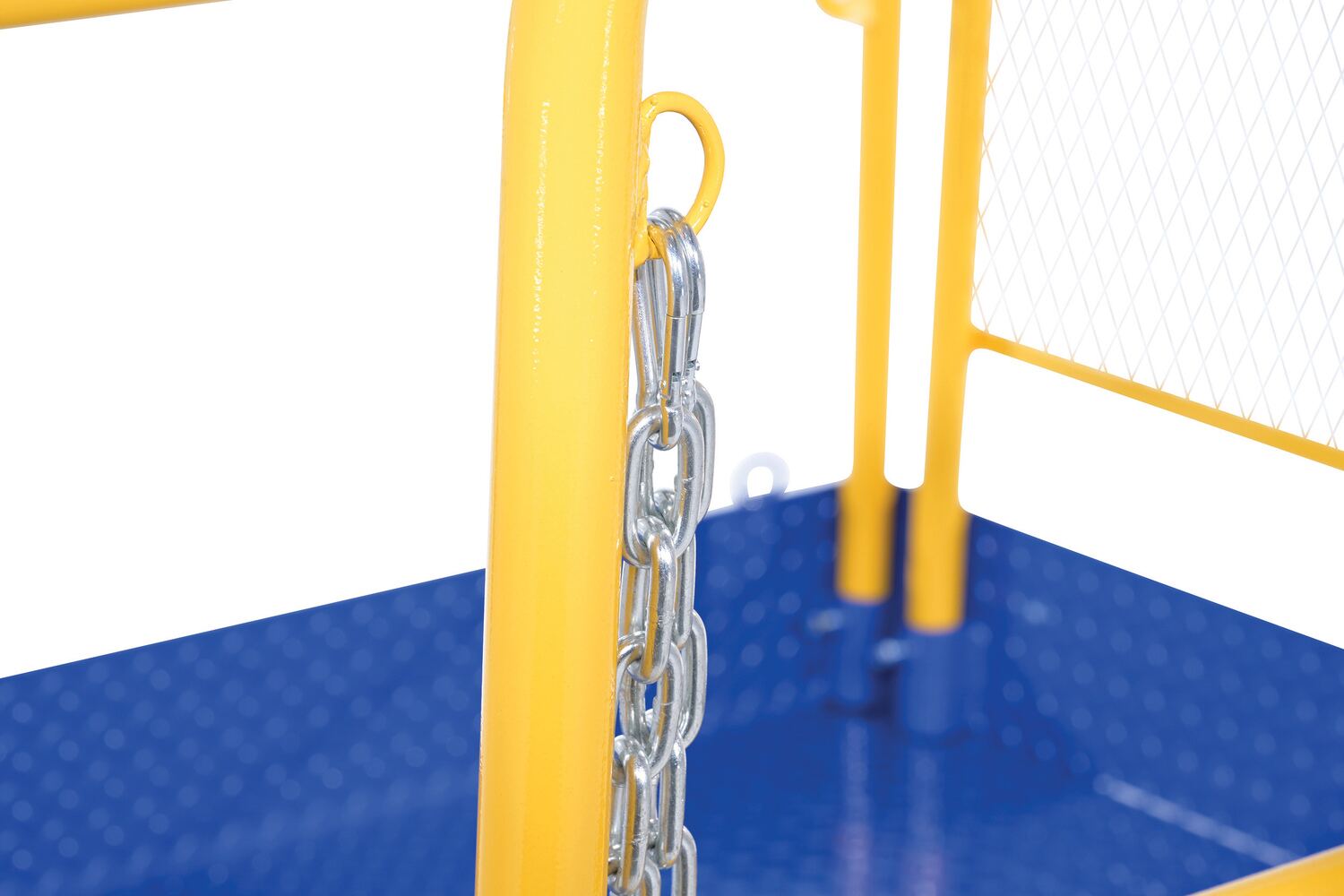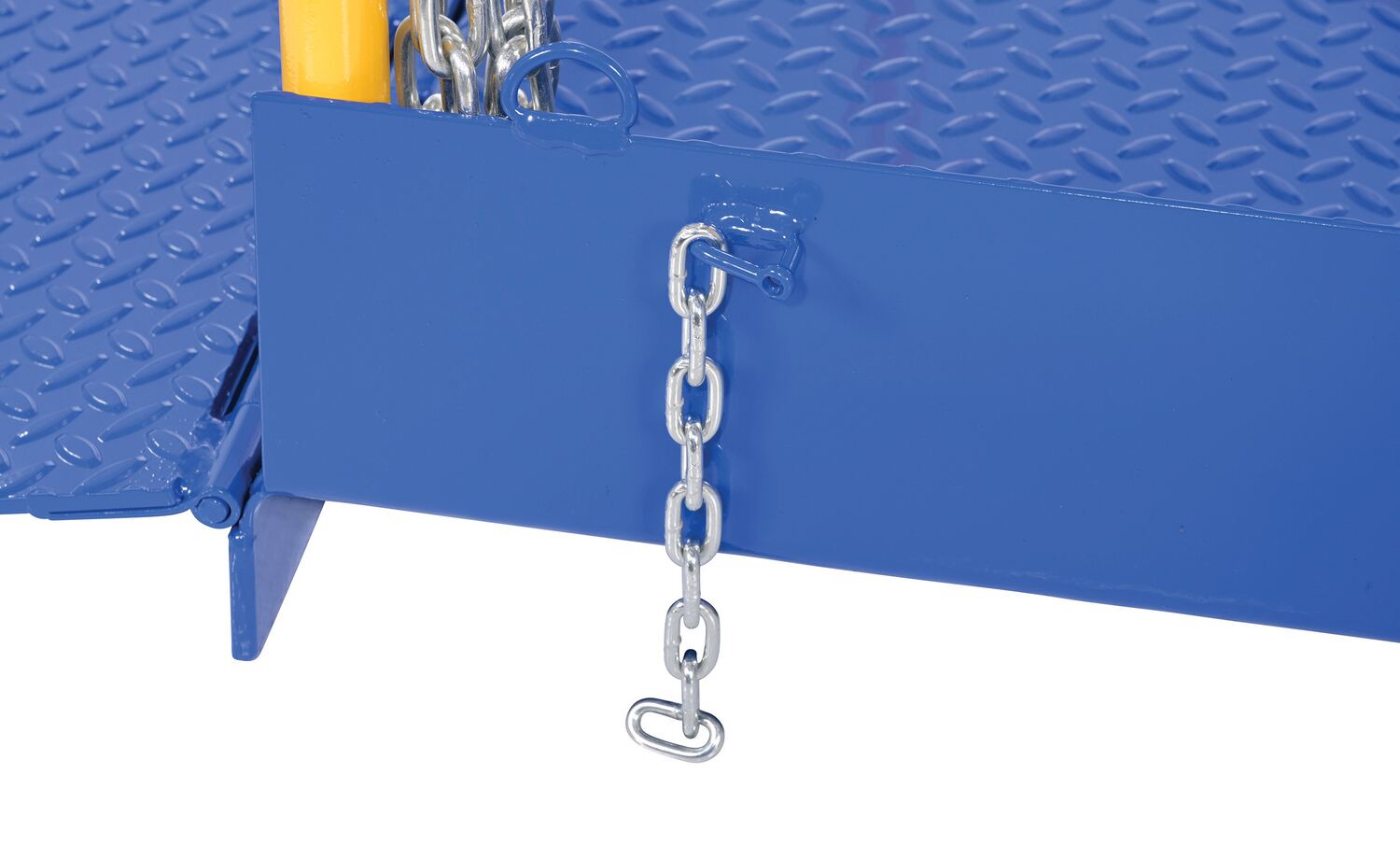 Steel Economical Portable Loading Platform with Handrails 54 In. x 54 In. 2000 Lb. Capacity BlueThis loading platform for fork trucks allows fork trucks to load/unload items into trucks and trailers. Maximum uniform weight capacity is dependent on fork truck capacity. Includes fold-down lip to help with transition. Side guard toe boards. Four (4) tie-down rings are included for securing equipment (tie downs not included). Diamond tread plate floor for extra traction. Handrails on two (2) sides, back mesh screen and chain to secure open end. safety strap (included) to secure platform to fork truck. Steel construction with blue baked-in powder-coated toughness.