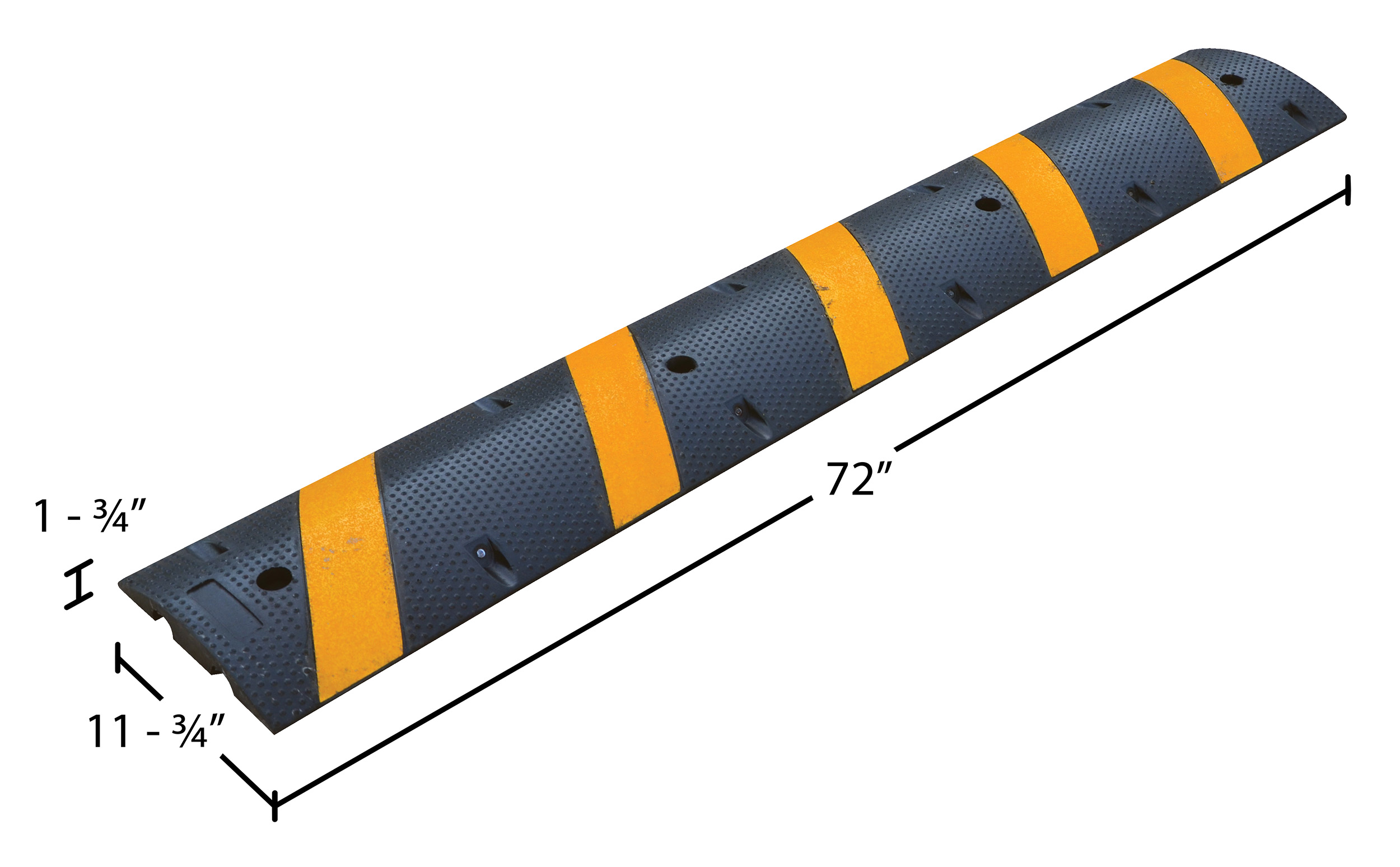 The molded rubber speed bump is ideal for warning drivers in parking areas and warehouses. Featuring reflective diagonal stripes and "cats eyes" for visibility, a heavy-duty molded rubber construction for durability, and pre drilled installation holes. Mounting hardware included. Optional end caps available upon request.
