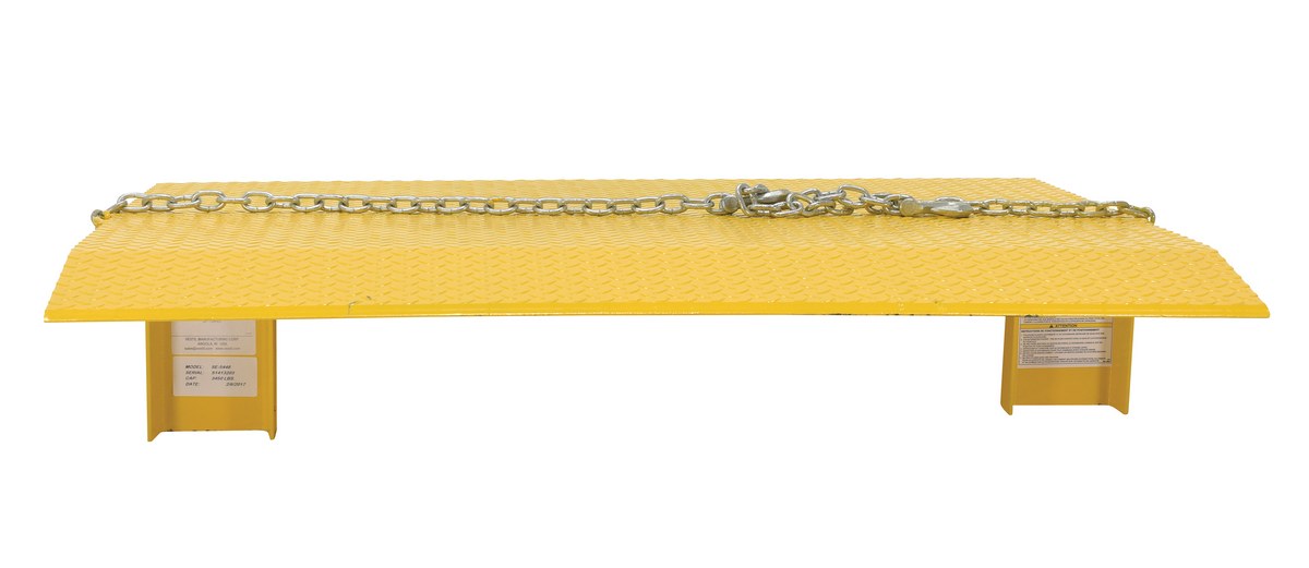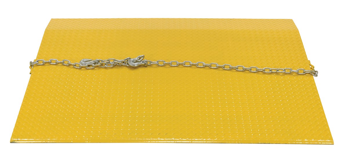 Steel Truck Dock Plate 48 In. x 54 In. x 9-9/16 In. 3,450 Lb. Capacity YellowThe steel truck dock plate is constructed of high strength INX-55 (55,000 psi) steel. Safety locking legs prevent slippage between truck and dock. Safety tread plate helps provide positive traction. Beveled edges for smooth entry and exit. Chain pickup comes standard. Designed with an 11 degrees bend located 9" from the beveled edge. The legs are 10" from the beveled edge. Manufactured in compliance with OSHA. When using three wheeled pallet trucks, select capacity +20% due to concentrated load center of board.