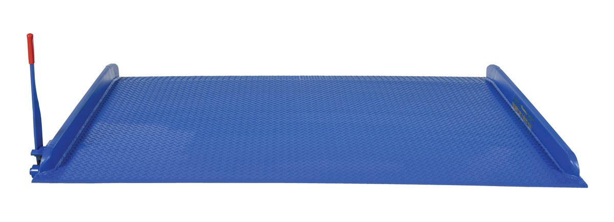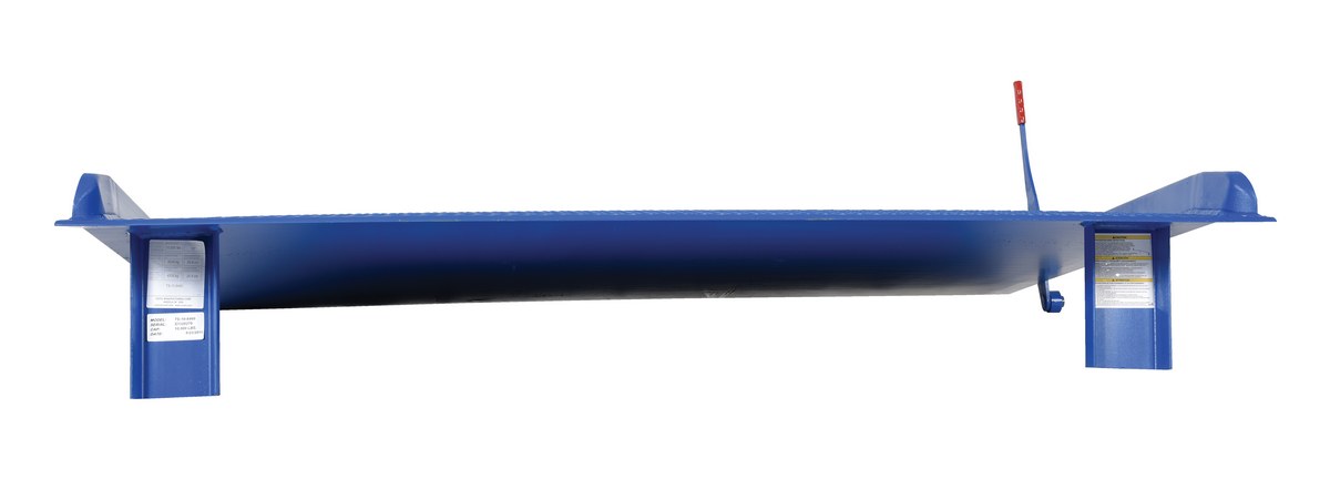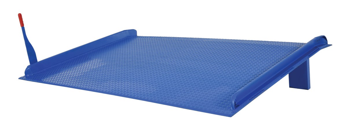 Steel Truck Dock Board 84 In. x 60 In. 10,000 Lb. Capacity BlueThe steel truck dock board is constructed of high strength (55,000 psi) steel for long life. Deck is diamond plated for safe, efficient use. Locking legs minimize ramp movement and are uneven to allow the dock board to sit canted for easier floor pickup by fork trucks when not in use. Standard with lever lift for quick portability with fork truck. Legs are located 12" from the edge of the dock board. Manufactured in compliance with OSHA. Optional accessories: lifting chains, span locks, span pins/holes and removable pickup loops.